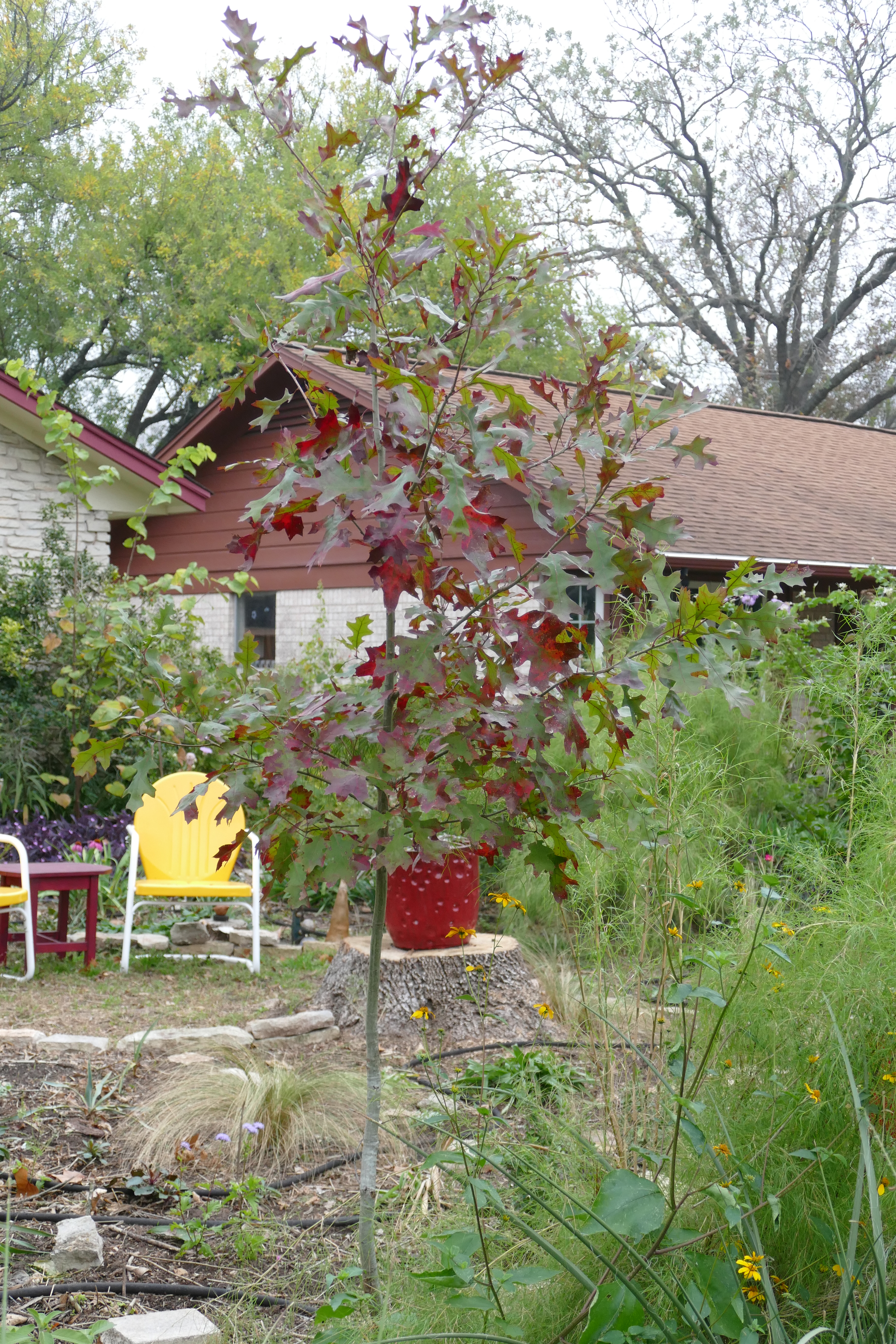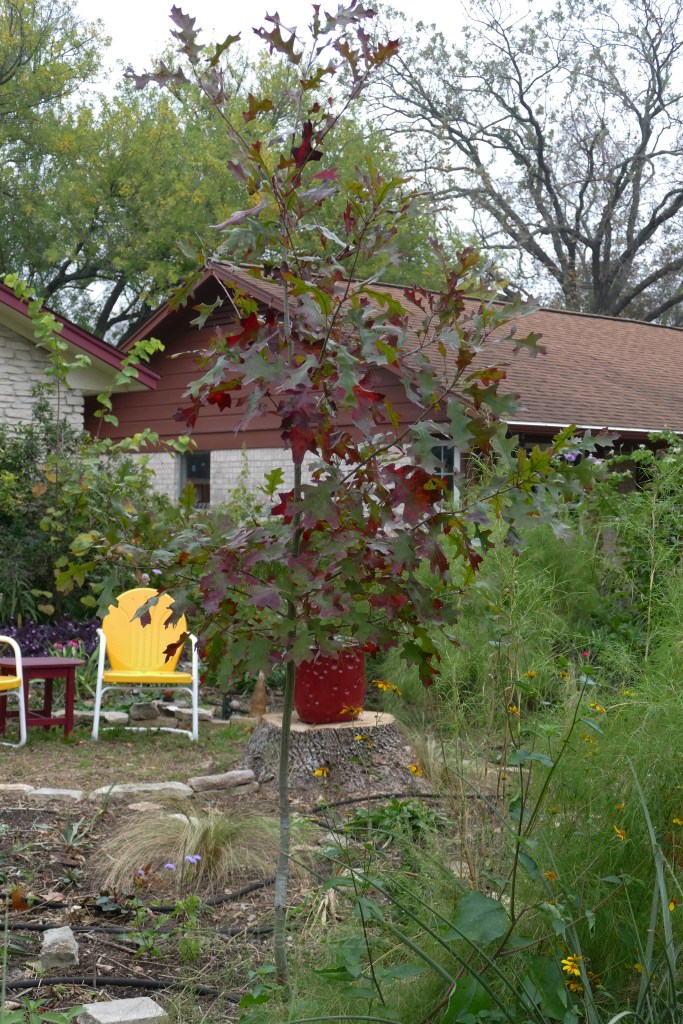 Red Yucca, Hesperaloe parviflora, adds lofty salmon flowers and keeps the little Red Oak tree company.