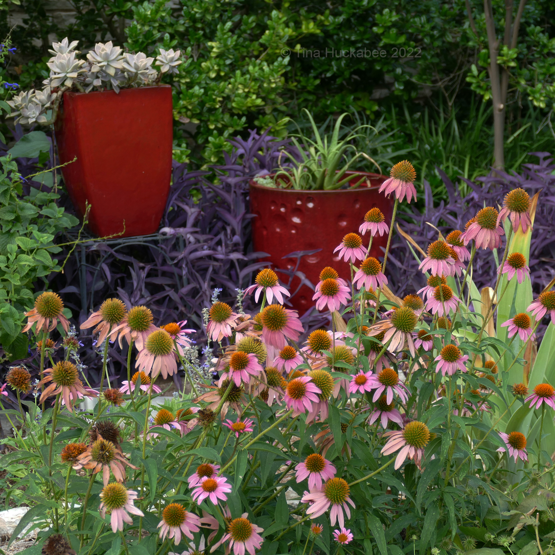 Purple Coneflower, Echinacea purpurea, always puts on a good show, though the blooms are mostly done and seeds are spent; I’m currently pruning them to the ground, their rosette set to weather the remainder of summer. Coneflowers generally return in autumn with rain and cooler temperatures, not as tall or prolifically, but flowering nonetheless. While that’s something to look forward to, temperate weather seems almost an impossible dream right now.