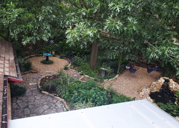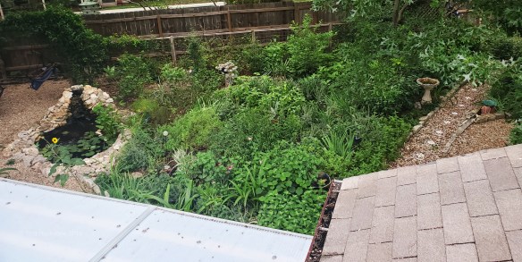 Moving leftward, the main garden with the pond, comes into view. My back garden is shady (pop-up sunflower, notwithstanding) and growing showy flowers is challenging, but I’m pleased that foliage variety is apparent from above and lends interest to this large garden.