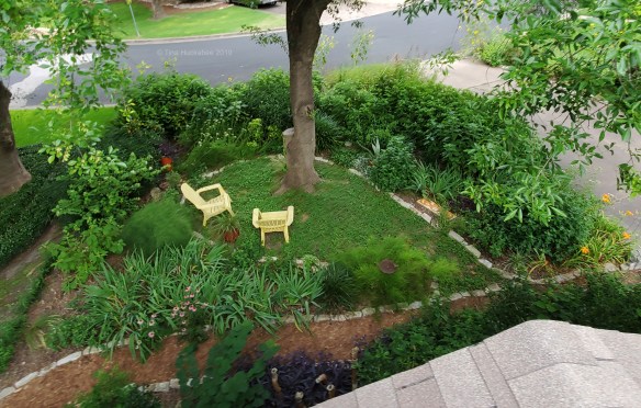 I take photos of my gardens at least once during each season because it’s a good way for me to see things that, somehow, I don’t directly observe with my eyes. The view from the roof is revealing and instructive, seeing my garden like the birds see it–looking down upon diverse and mixed foliage, and viewing the flow of pathways and islands of gardens. I now recognize that there are things and areas that I might change, but I’m glad my space is all garden, full and lush, and a welcome home for critters.