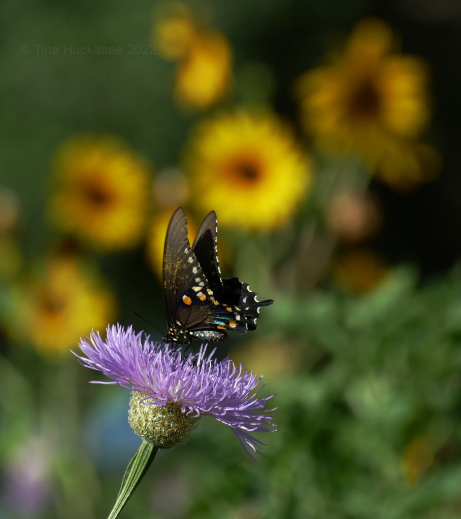 Wings-up is another Pipevine enjoying the bounty of an American Basket-flower, Centaurea americana. Non-native sunflowers look on with envy, though they have plenty of visitors of their own.