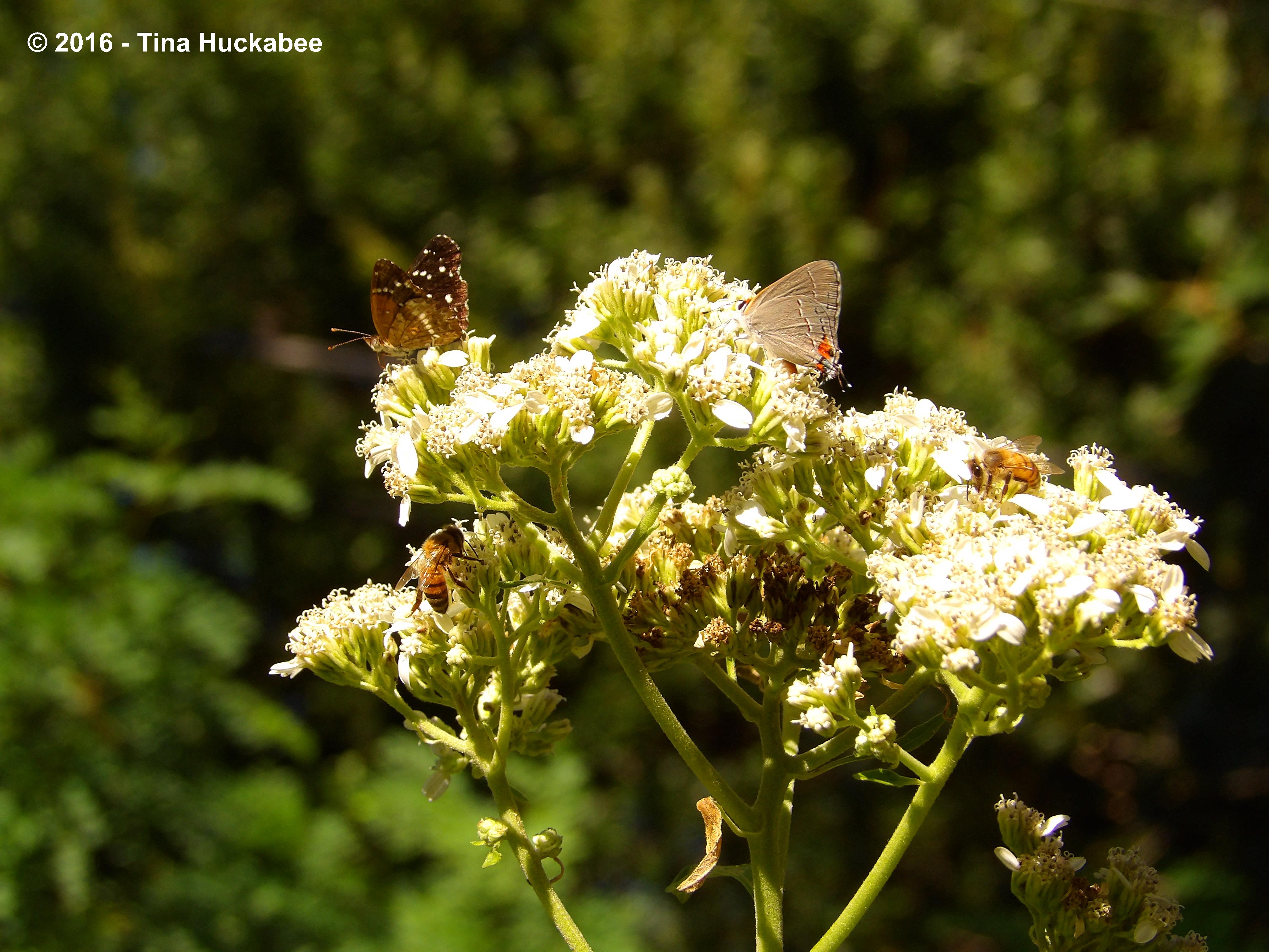 There are four individual pollinators on this particular flower cluster–and it’s not unusual to see that many pollinators simultaneously feeding on Frostweed bloom clusters. Where Frostweed grow, insect–especially pollinator–activity is abundant. Both small and large butterflies, honey and native bees, and eventually, after the blooms are spent, little finches and warblers choose this plant as a favorite food source. It, along with the Plateau goldeneye, are amazing plants for attracting and feeding wildlife. Both plants are easy to grow (Texas natives!) and attractive; both fit especially well in a woodland garden or at the back of a perennial bed.