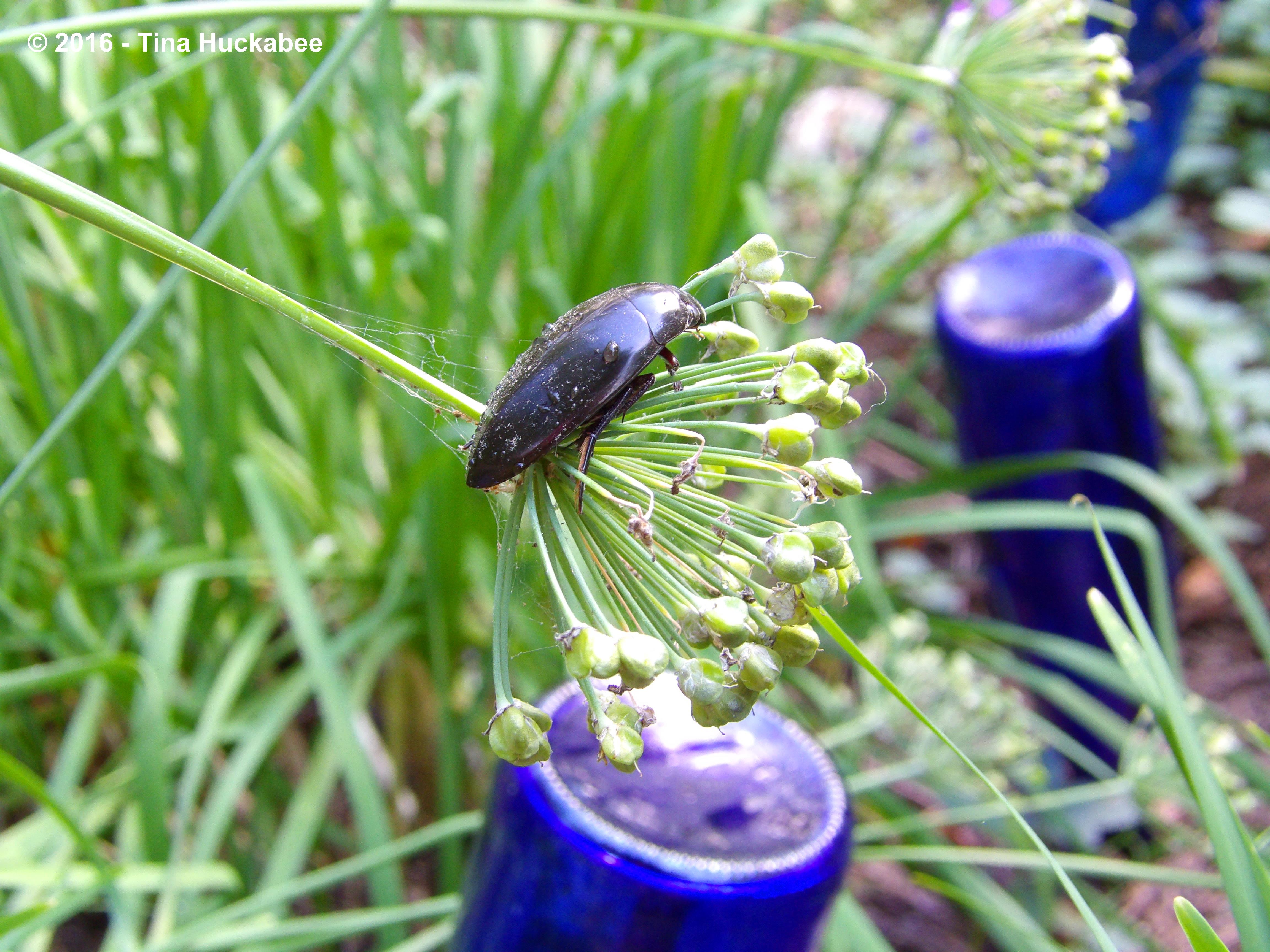 And this Hydrophilidae, a Water scavenger beetle, was loitering on a spent Garlic chives bloom.