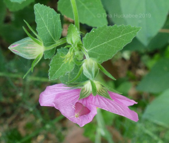 After a sweaty morning of gardening–tweaking in one area, planting in another, I was wrapping up the work by stowing shears and shovels. As I bumbled down the pathway, a single deep pink spot on one petal of a Rock rose, Pavonia lasiopetala, caught my eye. It was no heat related mirage that I spied, but a resting Pink moth, Pyrausta inornatalis.
