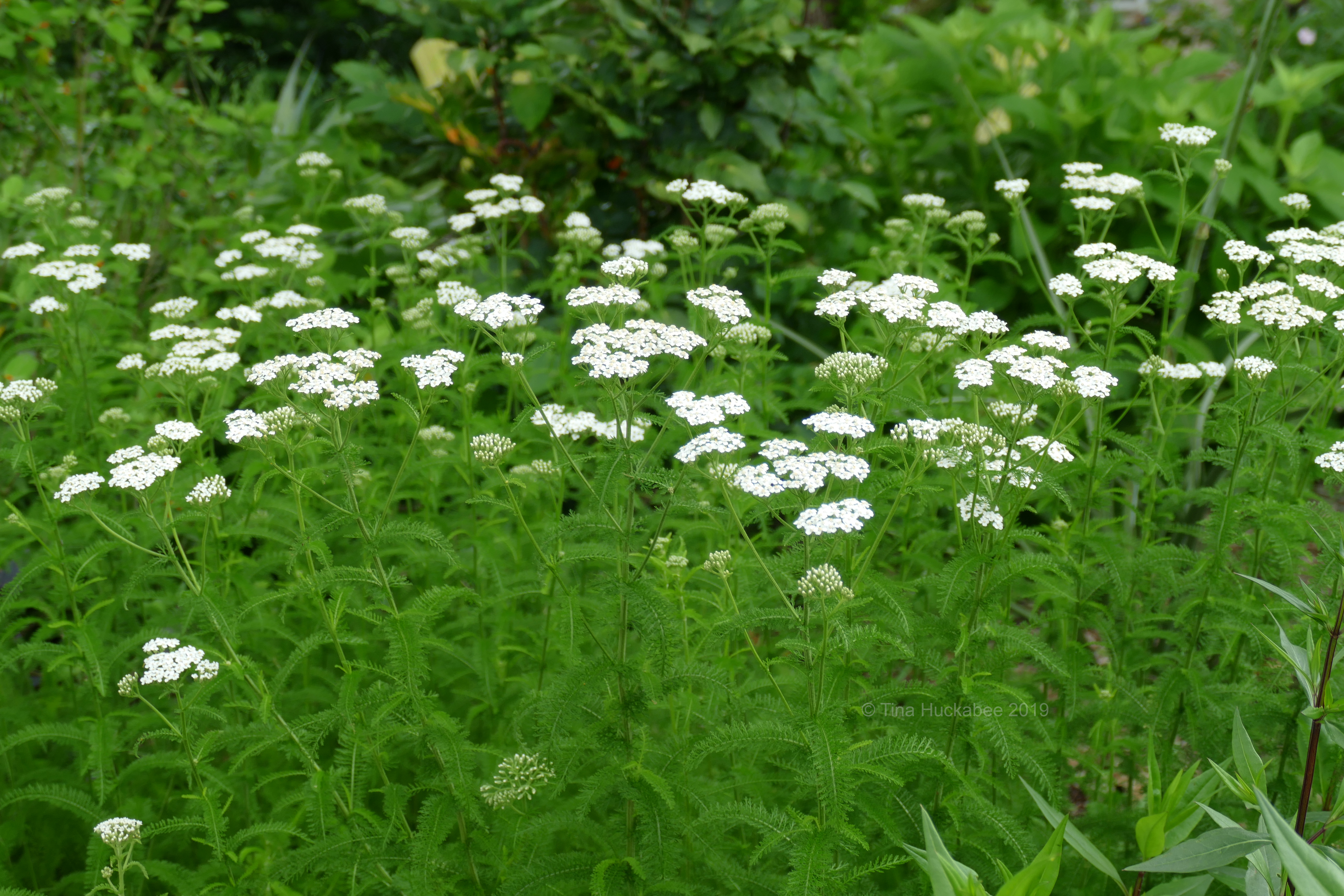 Yarrow, Achillea millefolium, is a pretty plant year-round, mostly due to its foliage. But in May, it sends up flower stalks and by June, those stalks are topped off with white flower clusters, adding their particular charm to bright June days.