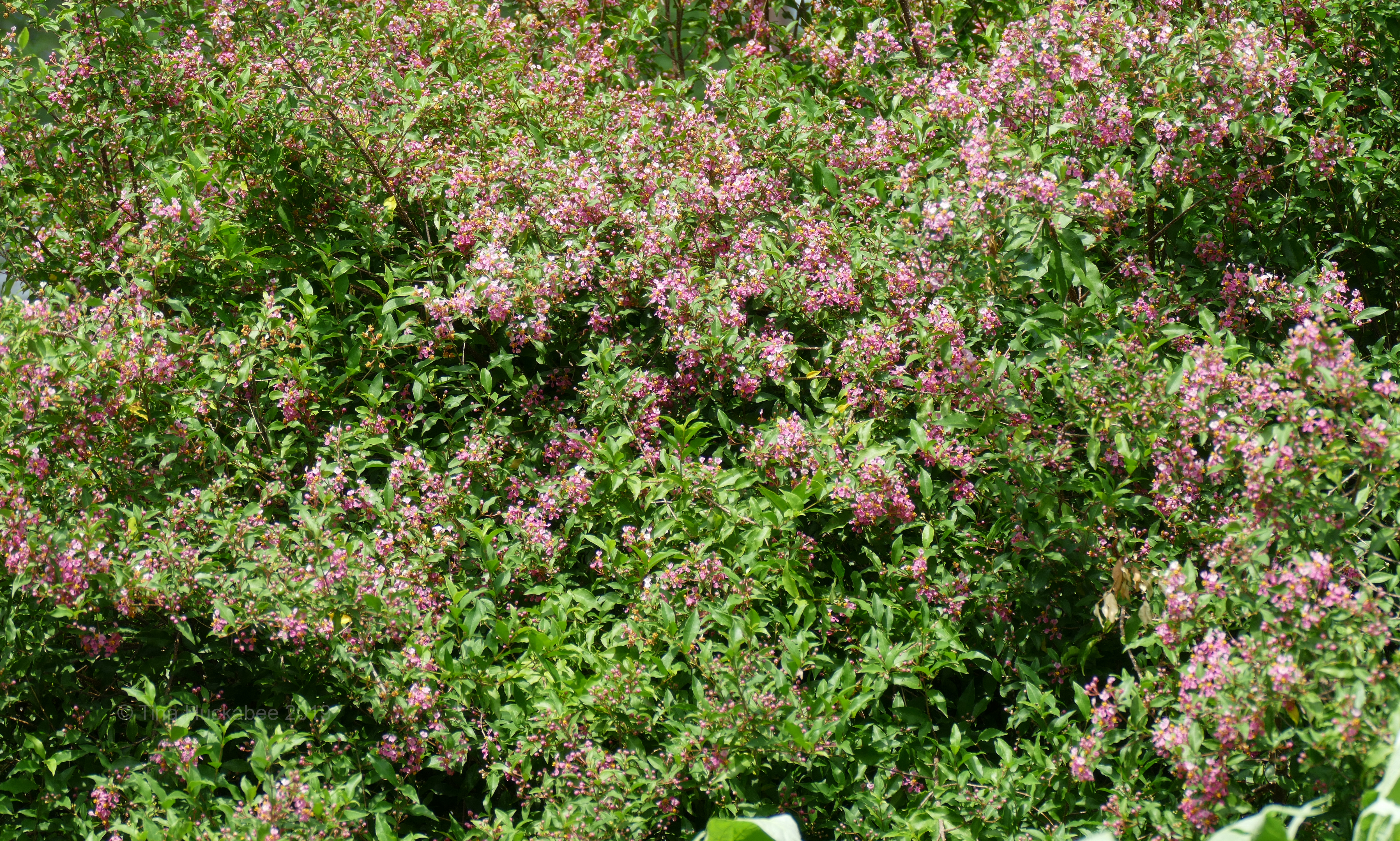 The pink flowers are small and dainty, borne in clusters along the branches.