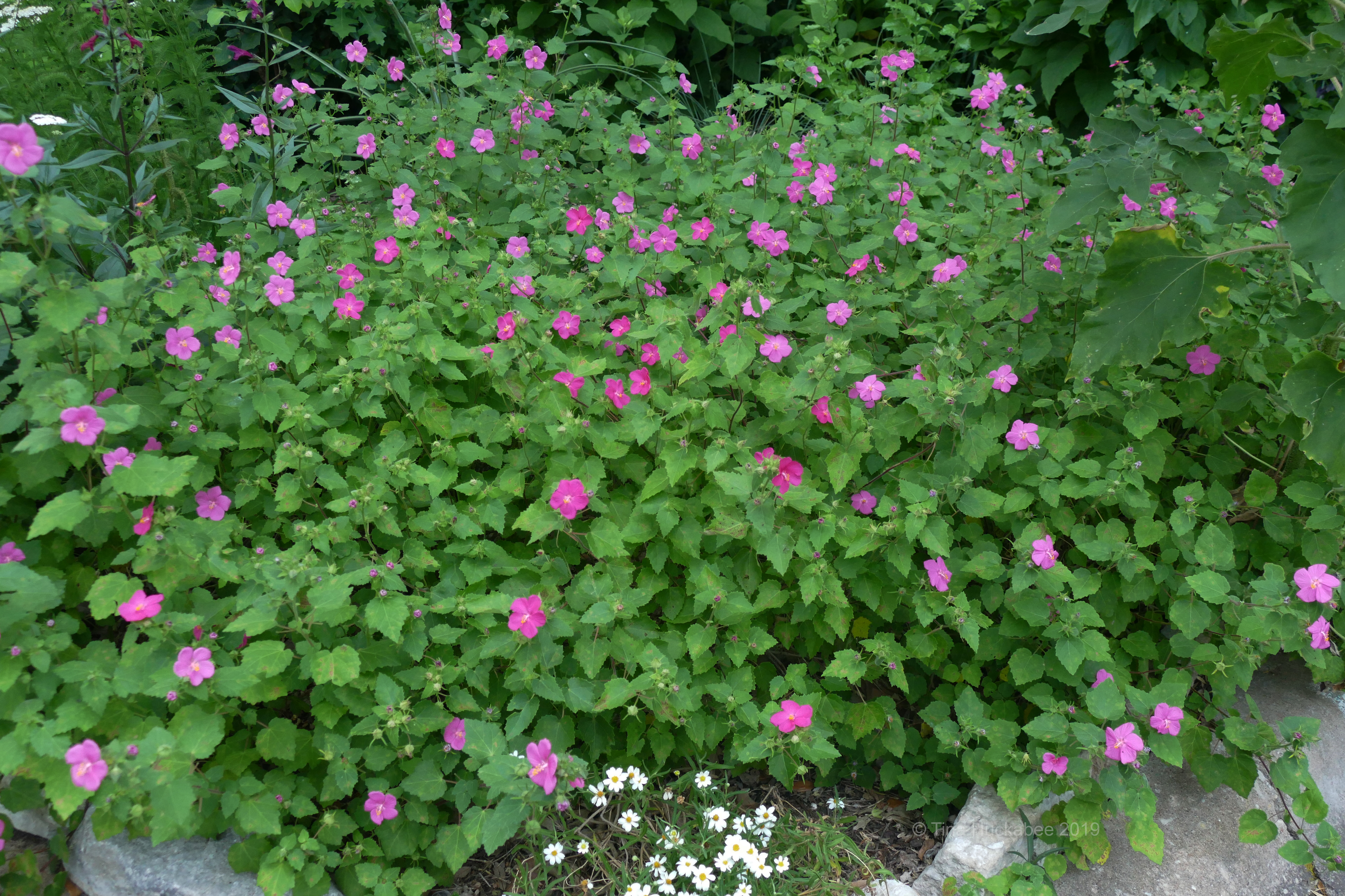 Pretty in pink are Rock rose, Pavonia lasiopetala. Another shrub with twinkly flowers, I utilize Rock rose as a staple plant in my garden. It grows and blooms in shade or sun (better in sun), and is a tough customer in our long, hot summers. I prune it back a few times during the growing season as it blooms best on new wood and will seed out prolifically if allowed. I like this little shrub planted in a mass to amplify the its pink power!
