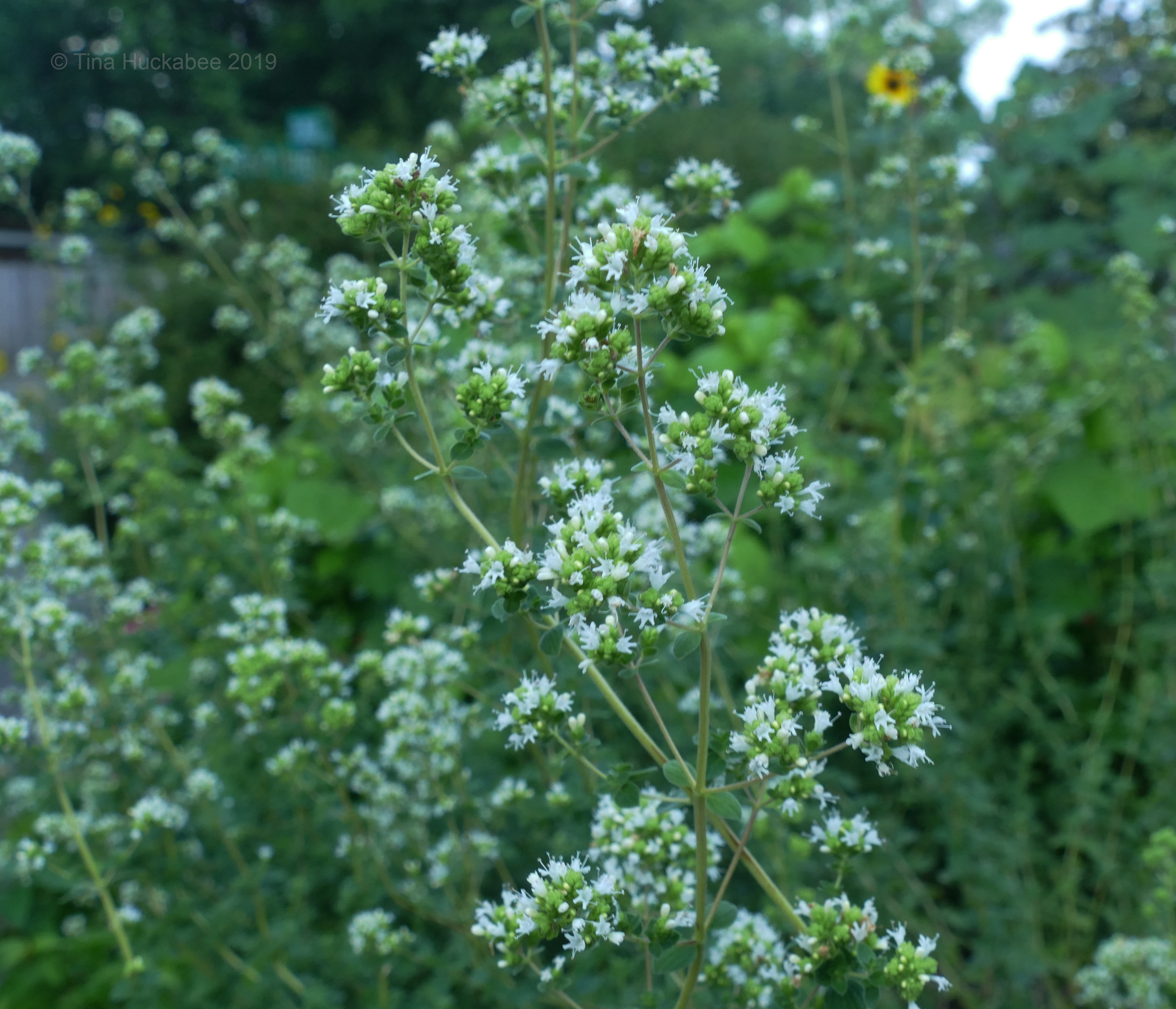I like oregano–a lot. Pollinators like oregano (and other herbs) blooms–a lot. The teeny-tiny, frothy white flowers of oregano are in full bloom mode right now and pollinators are all over them.