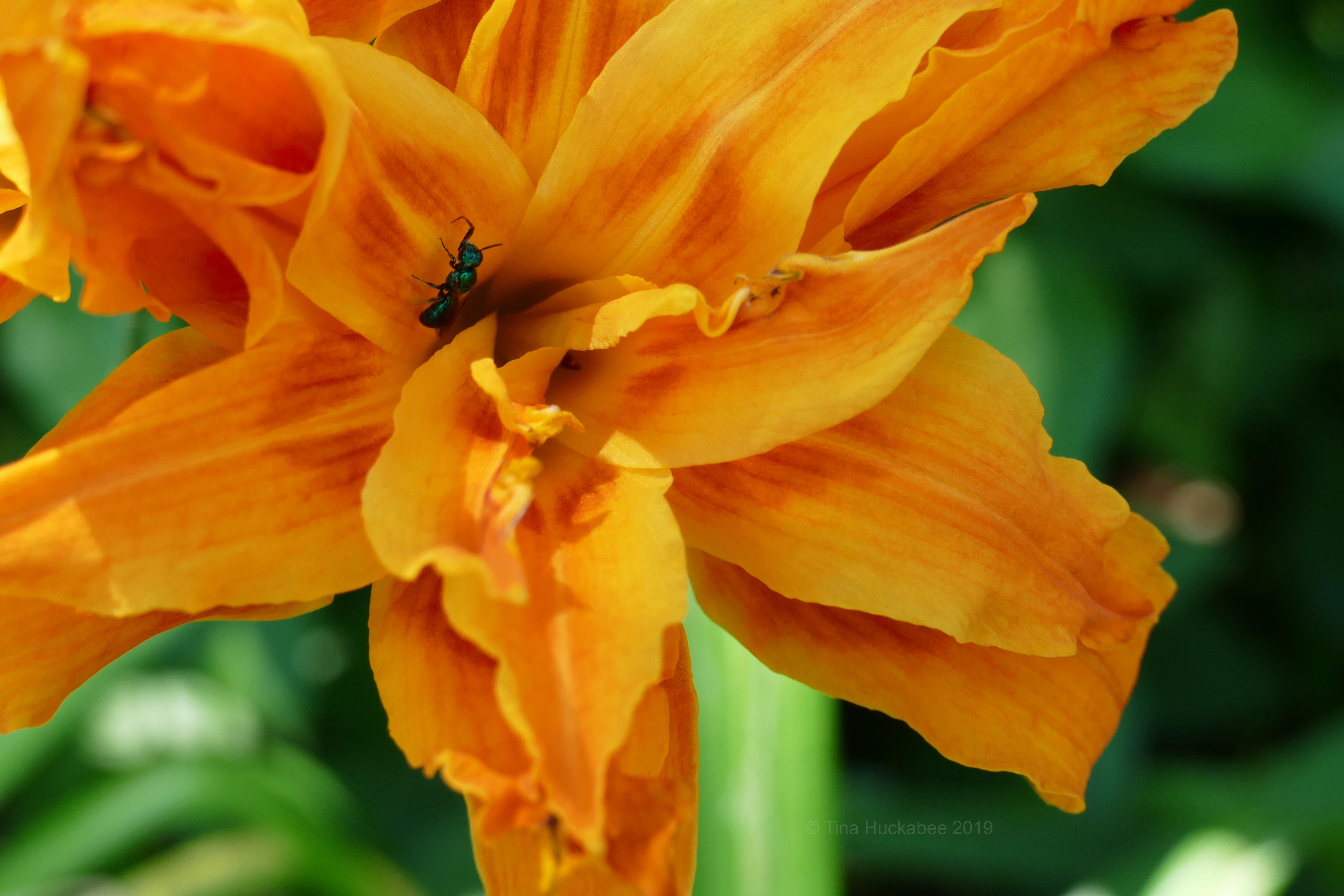 Full and ruffly, I look forward to the blooms every June, though sometimes they appear as early as May or as late as July. I believe they’re a form of the Asian variety Hermerocallis fulva.