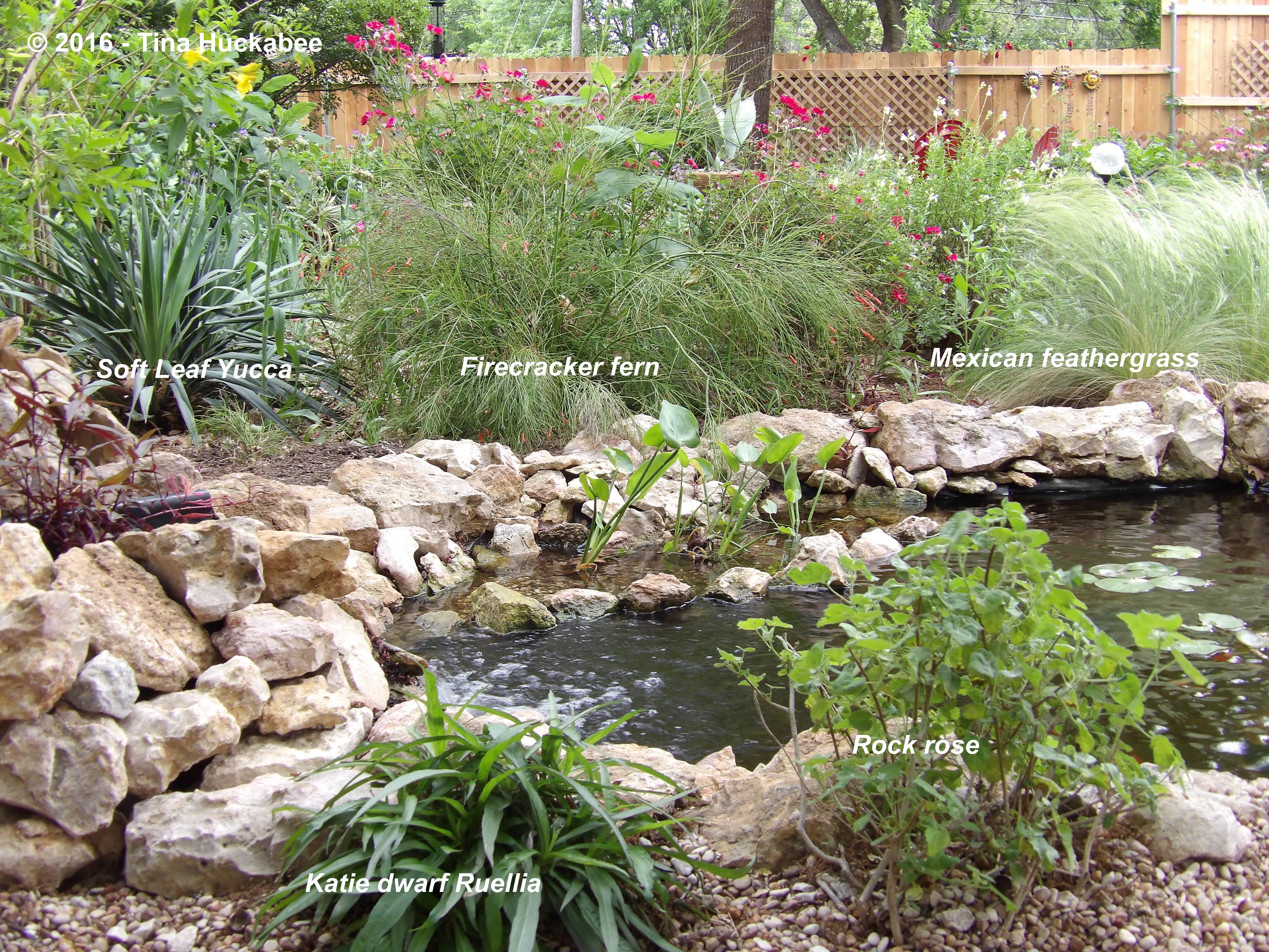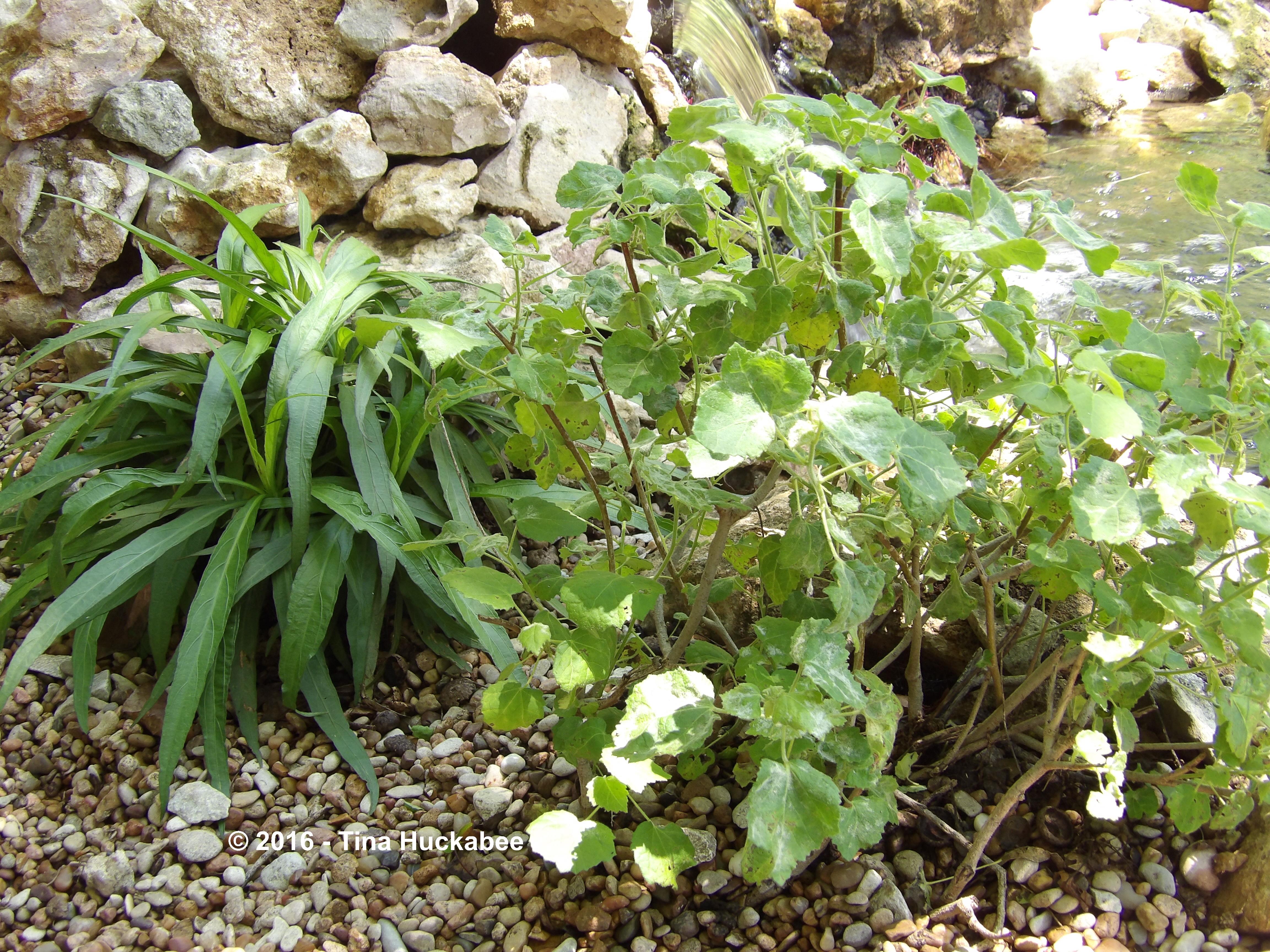 Across the pond from the perennial garden, is a pea gravel sitting area and pathway. A Katie dwarf Ruellia, Ruellia brittoniana ‘Katie’, and a Rock rose, Pavonia lasiopetala, volunteered themselves for this spot and fit well beside the pond.