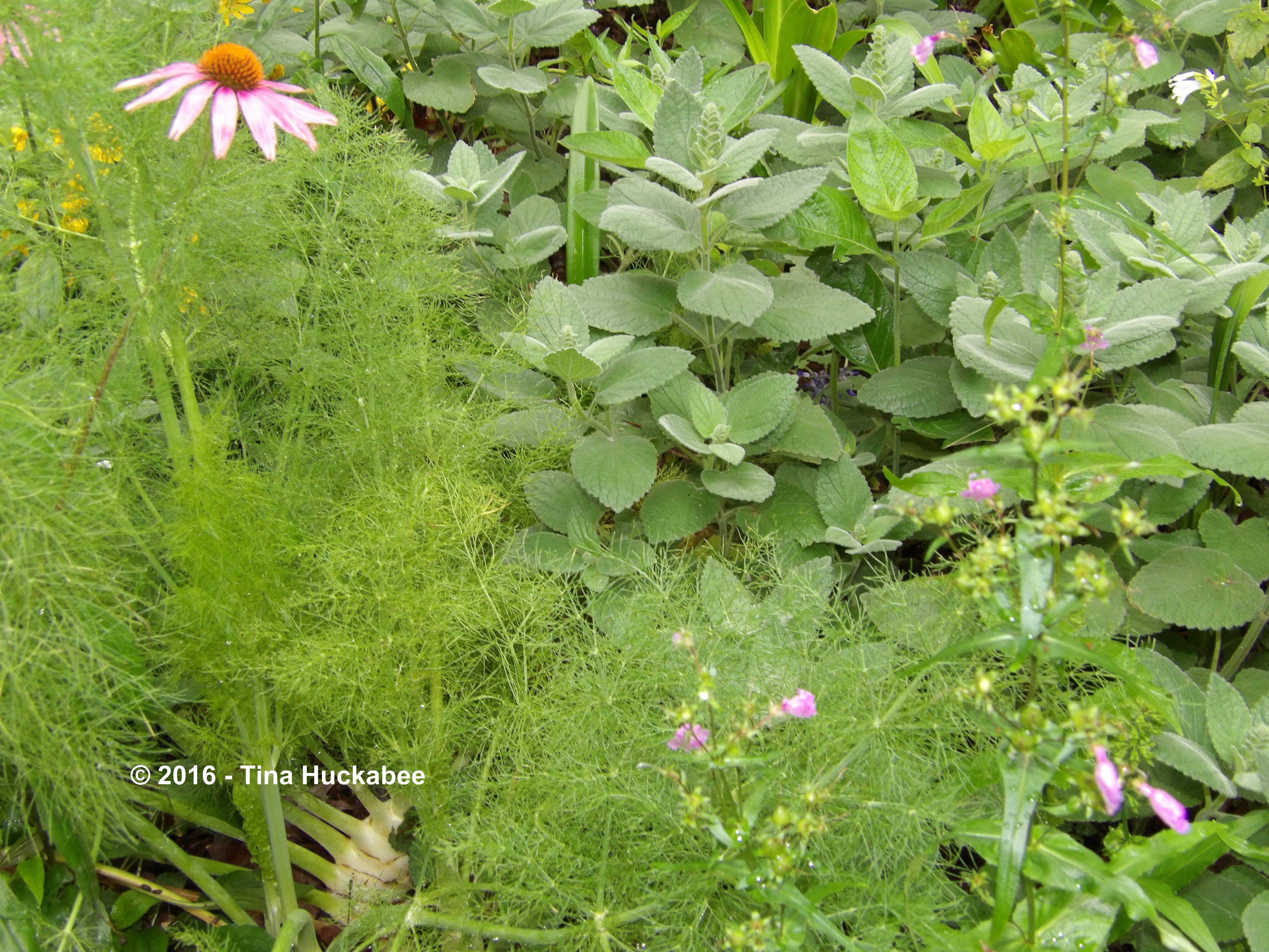 In the perennial bed bordering a different curve of the pond, a feathery, bright green fennel (planted for butterfly larvae), combines with grey-green Heartleaf skullcap, Scutellaria ovata. I guess it’s true that opposites attract.
