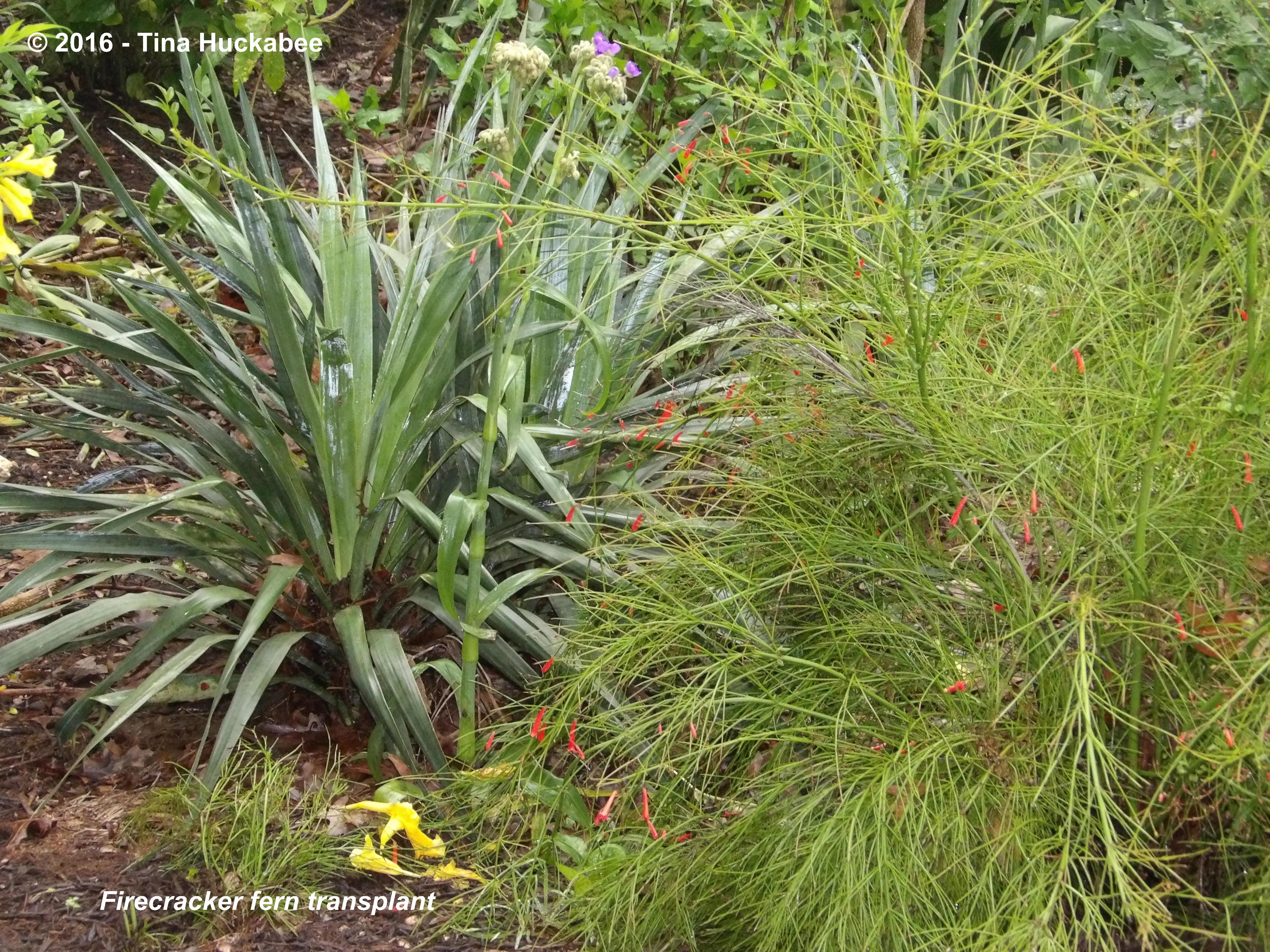 The evergreen Soft Leaf Yucca, Yucca recurvifolia, is a pup from the original, now-deceased mother plant. Just in front of the yucca, I recently transplanted some Firecracker fern, Russelia equisetiformis, that rooted out from the mother plant, to its right in the photo.