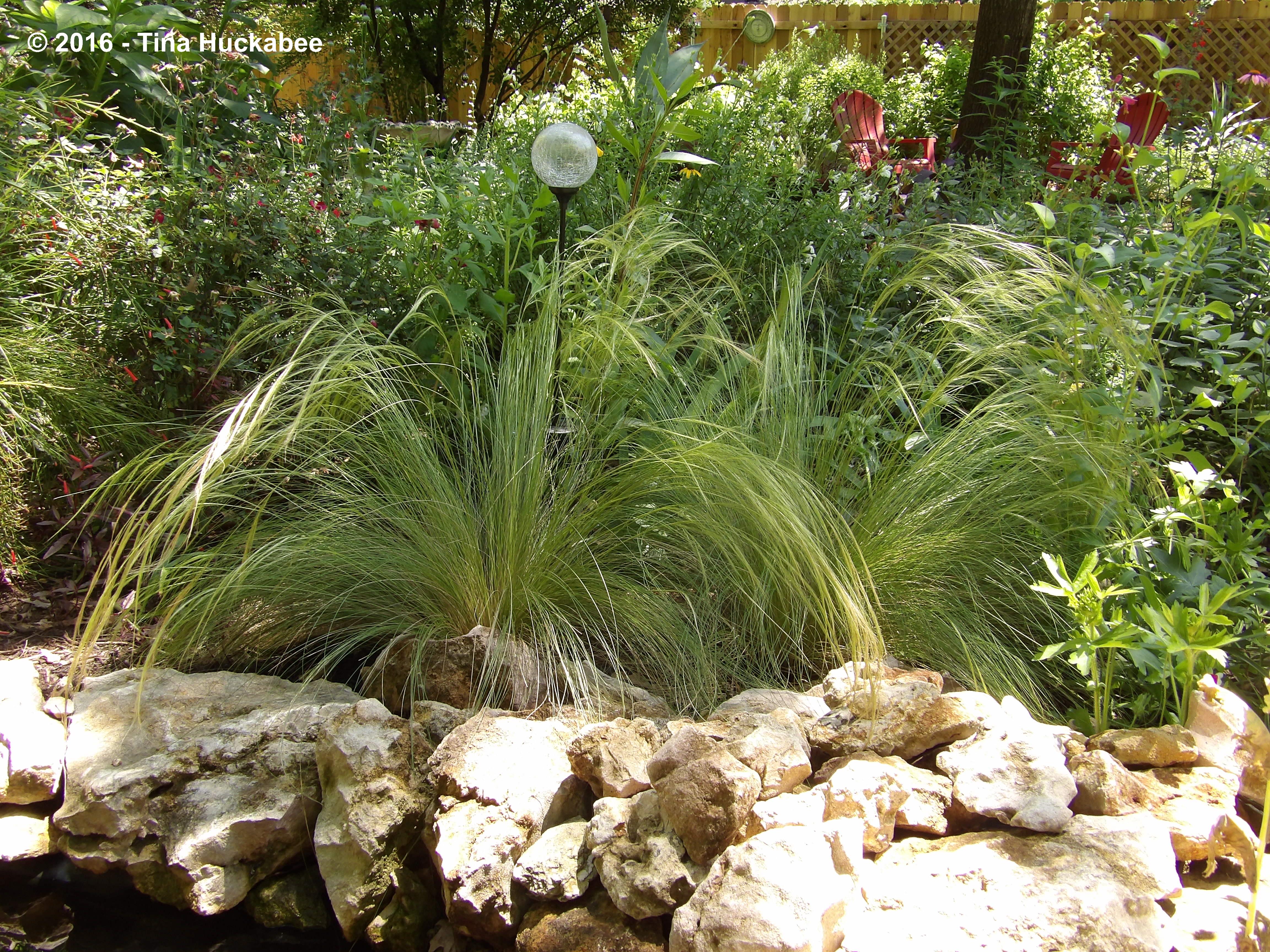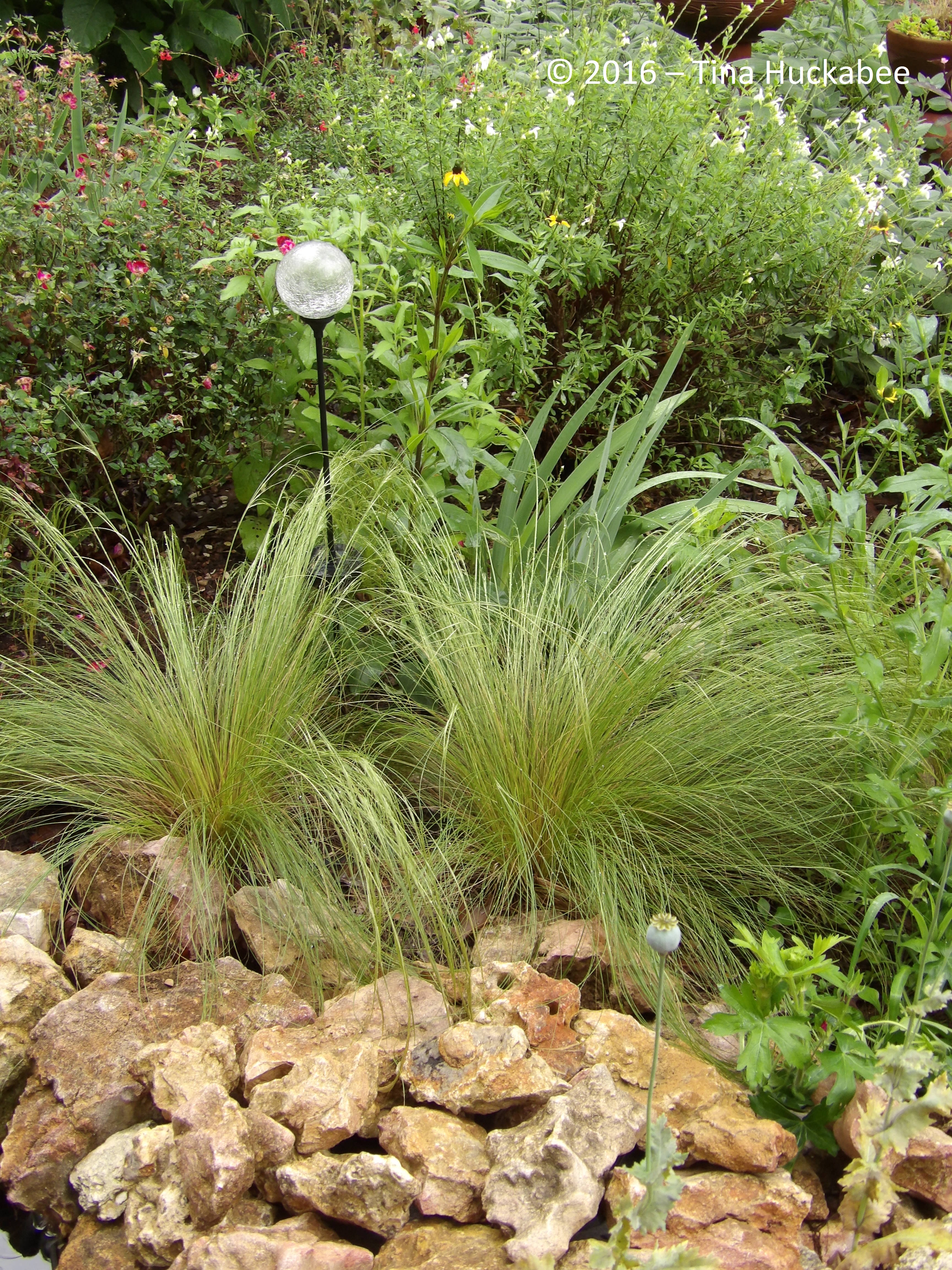 Behind the Mexican feathergrass, from left to right, is Martha Gonzalez rose, white blooming Autumn Sage (Salvia greggii), Iris, and Blackeyed Susan (Rudbeckia hirta var. pulcherrima)