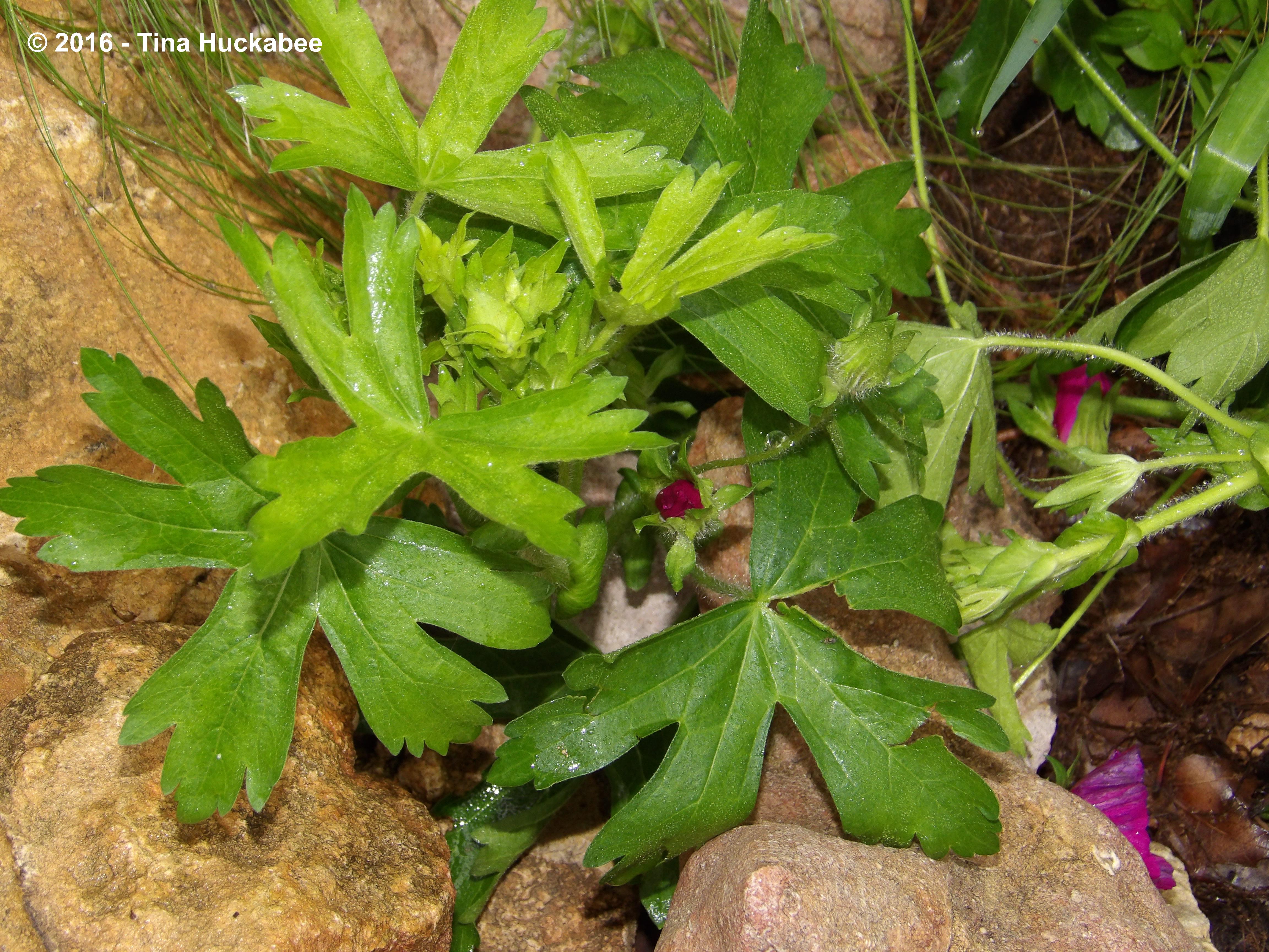 Individual leaves of Winecup are lobed and hairy. Winecup grows as a ground-cover and spreads about 3 feet wide during the bloom season, which is beginning.