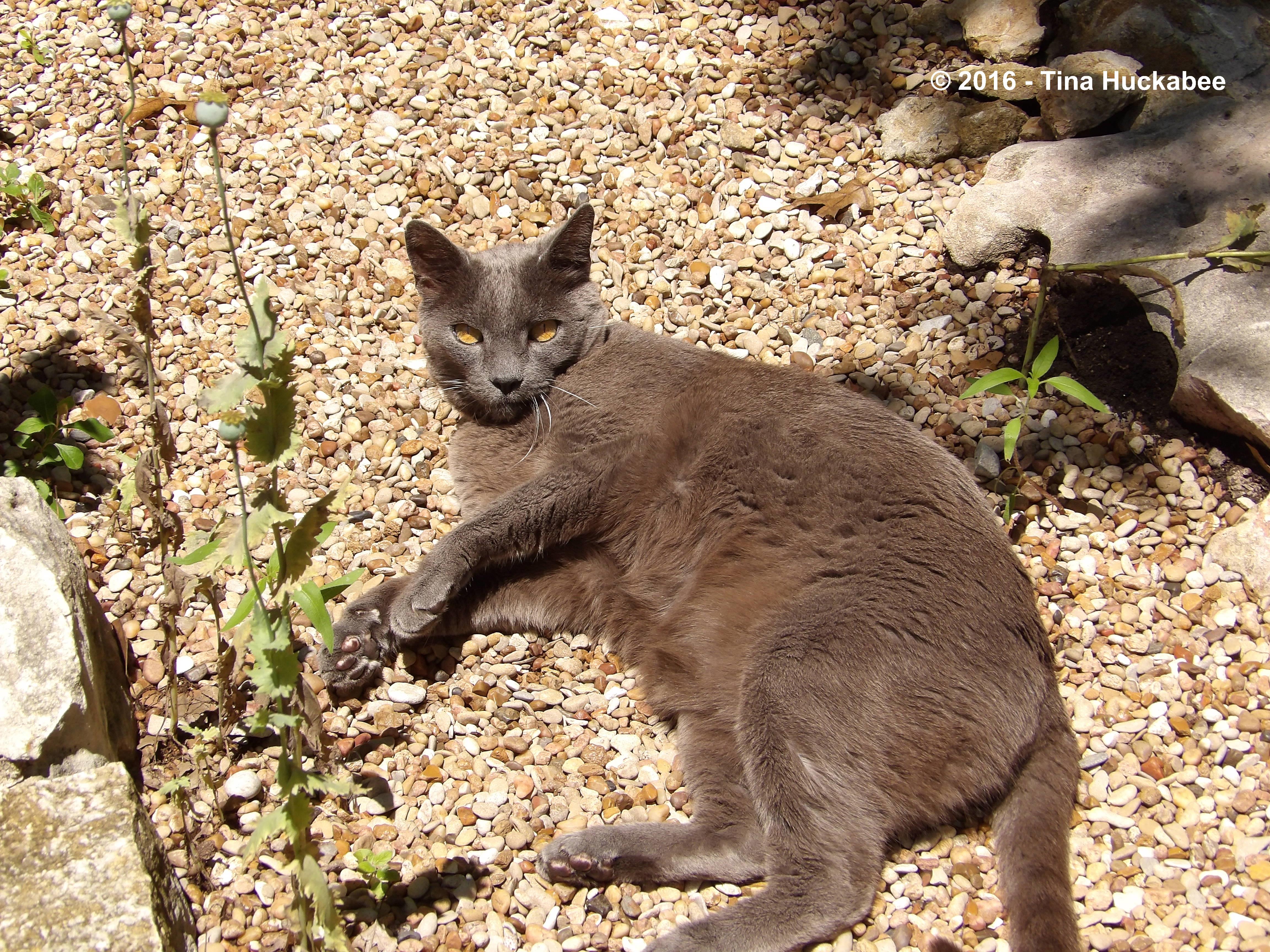 Nuri the Cat is comfy as he lies on the warmth of the pea gravel. Lazy cat.