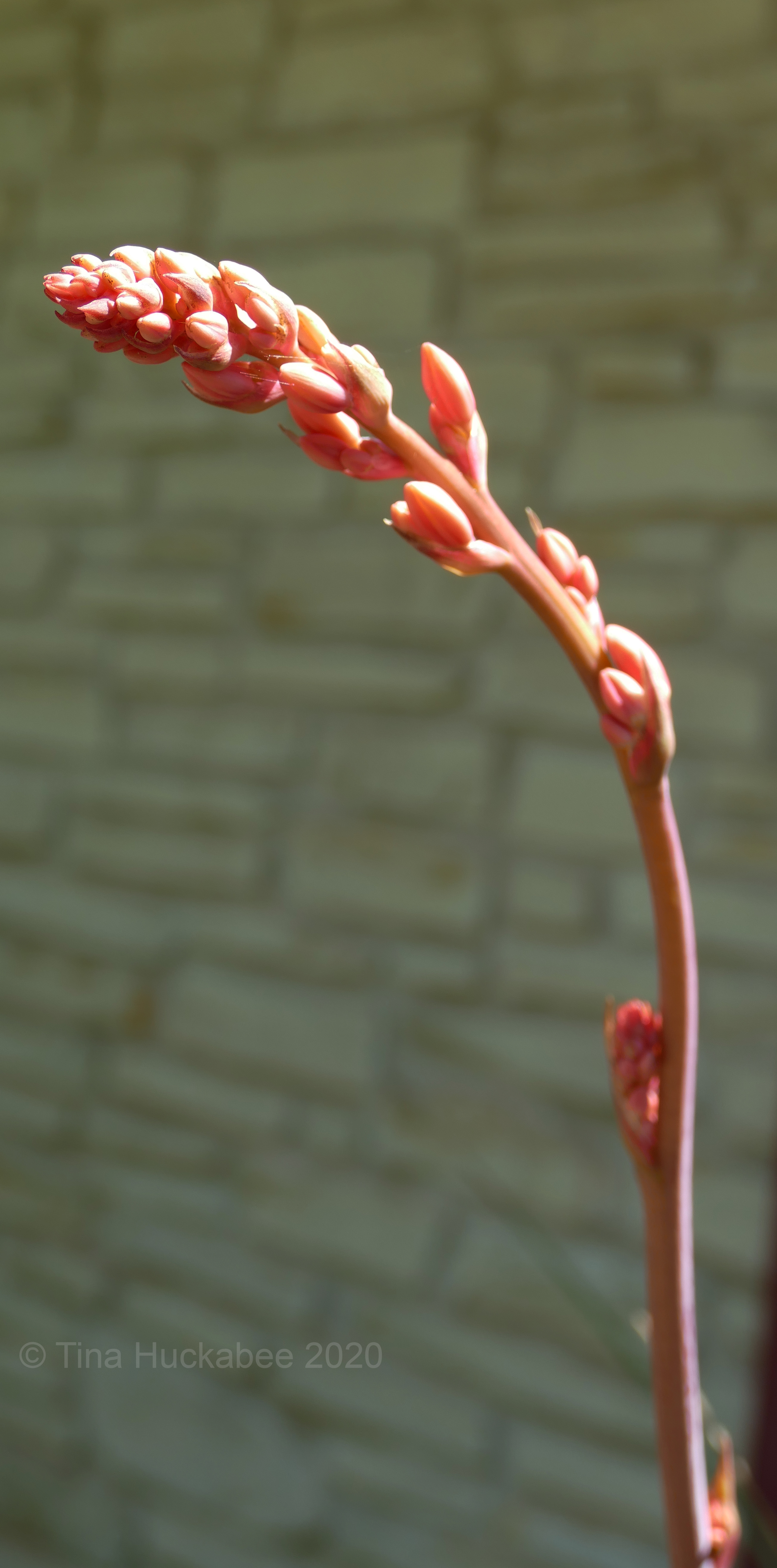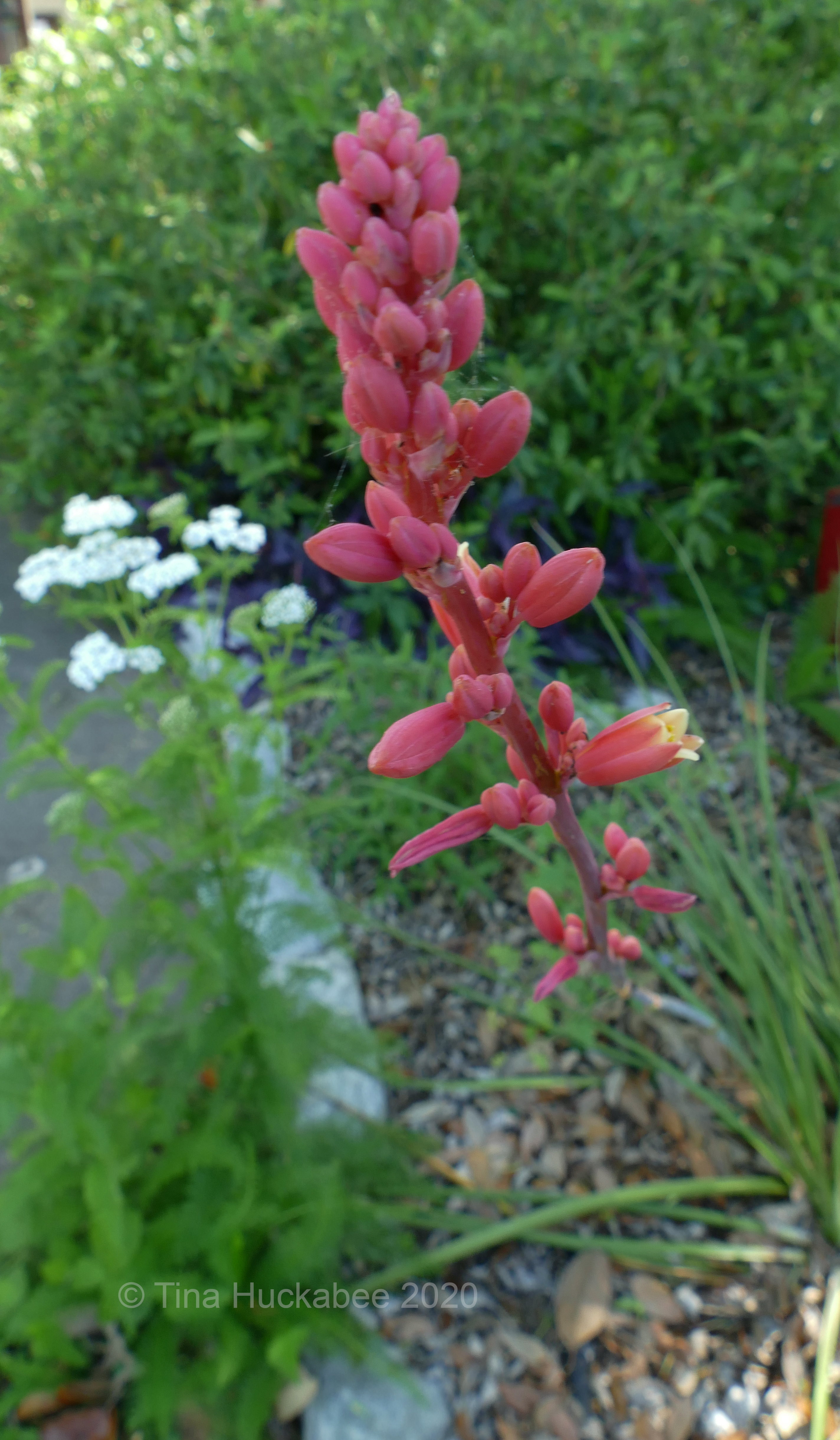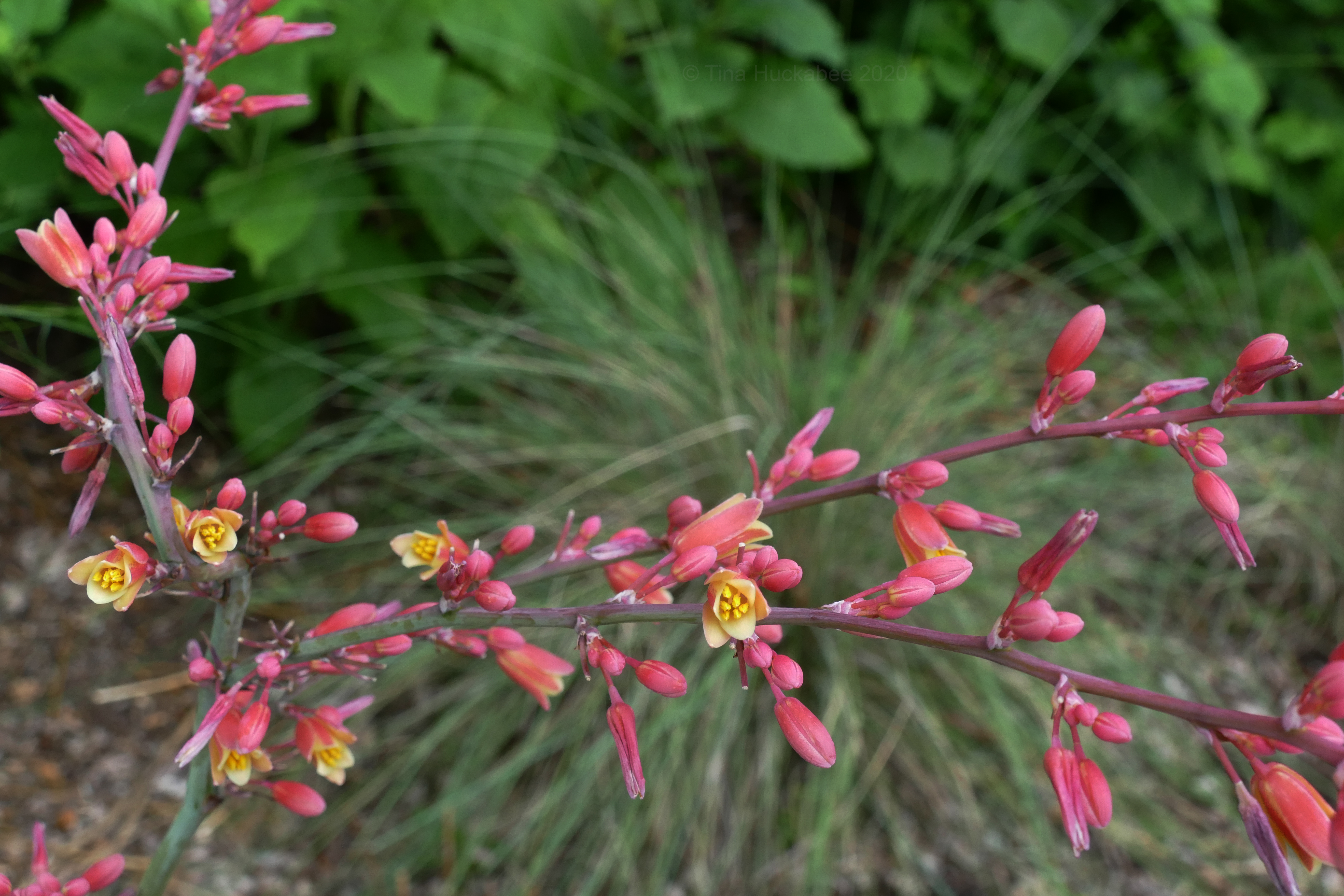 Red yucca, Hesperaloe parviflora, a member of the Agave family, sends up graceful stalks in spring, loaded with salmon-n-butter blooms, to the delight of of hummingbirds, native bees, and butterflies.