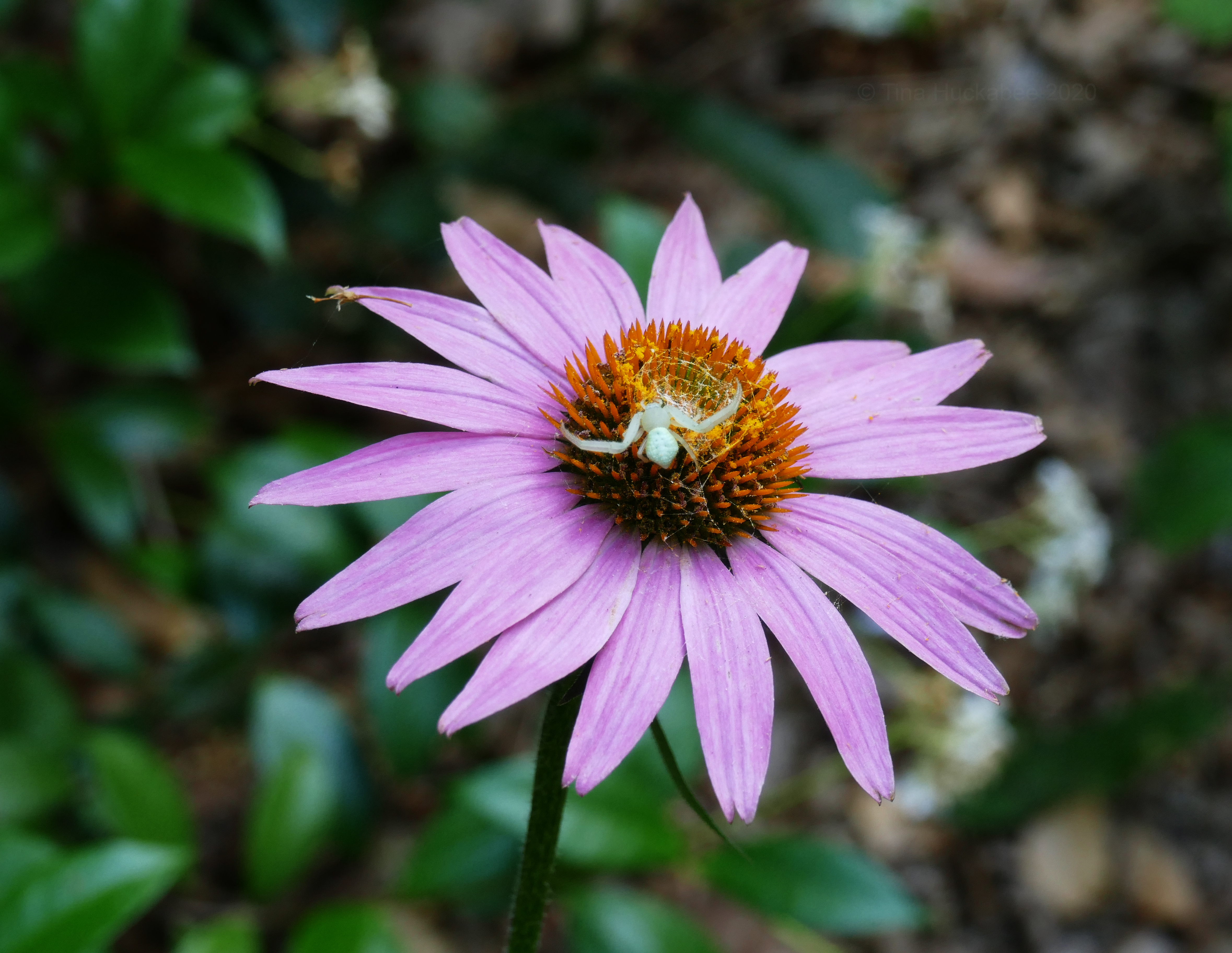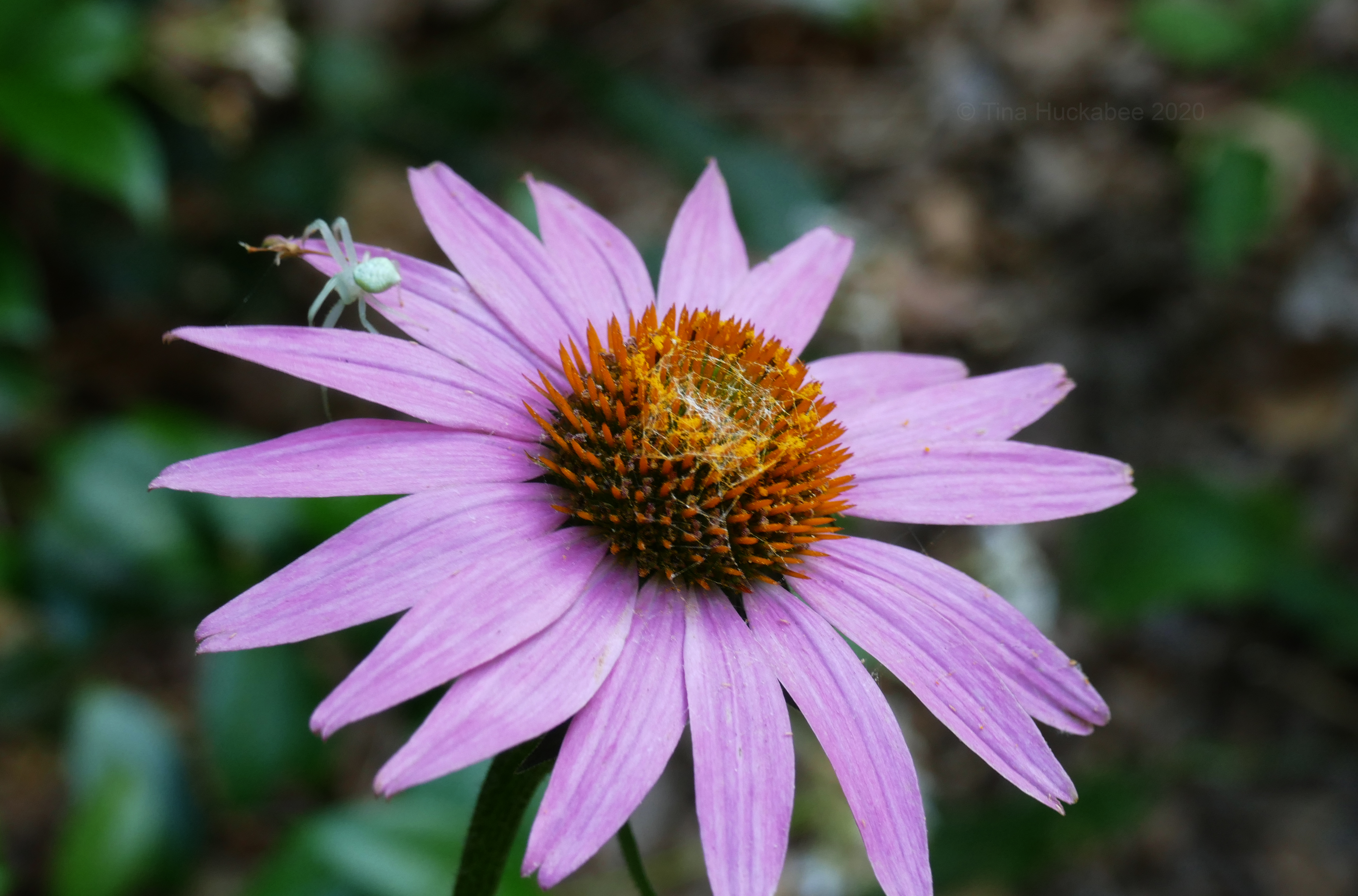 Purple coneflower, Echinacea purpurea, are in their prime and open for pollinators to sip from and gardeners to delight in. I spotted this Crab Spider waiting for a meal on an open coneflower bloom. The honeybees are fond of coneflowers, but I imagine it was a fly, syrphid fly, or small native bee that the crab was hoping for. Honeybees are a tad big for this little thing, though crab spiders are successful predators.