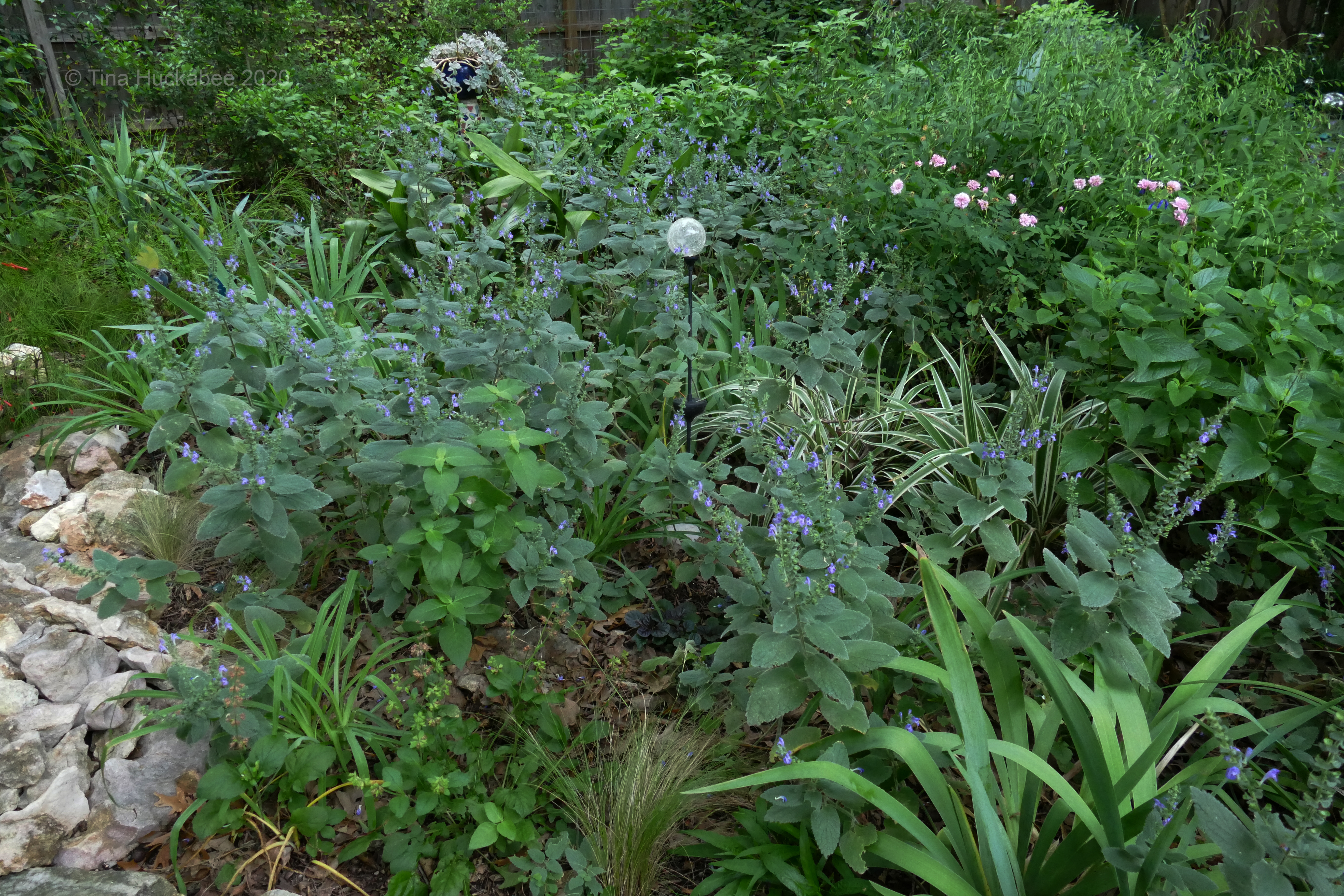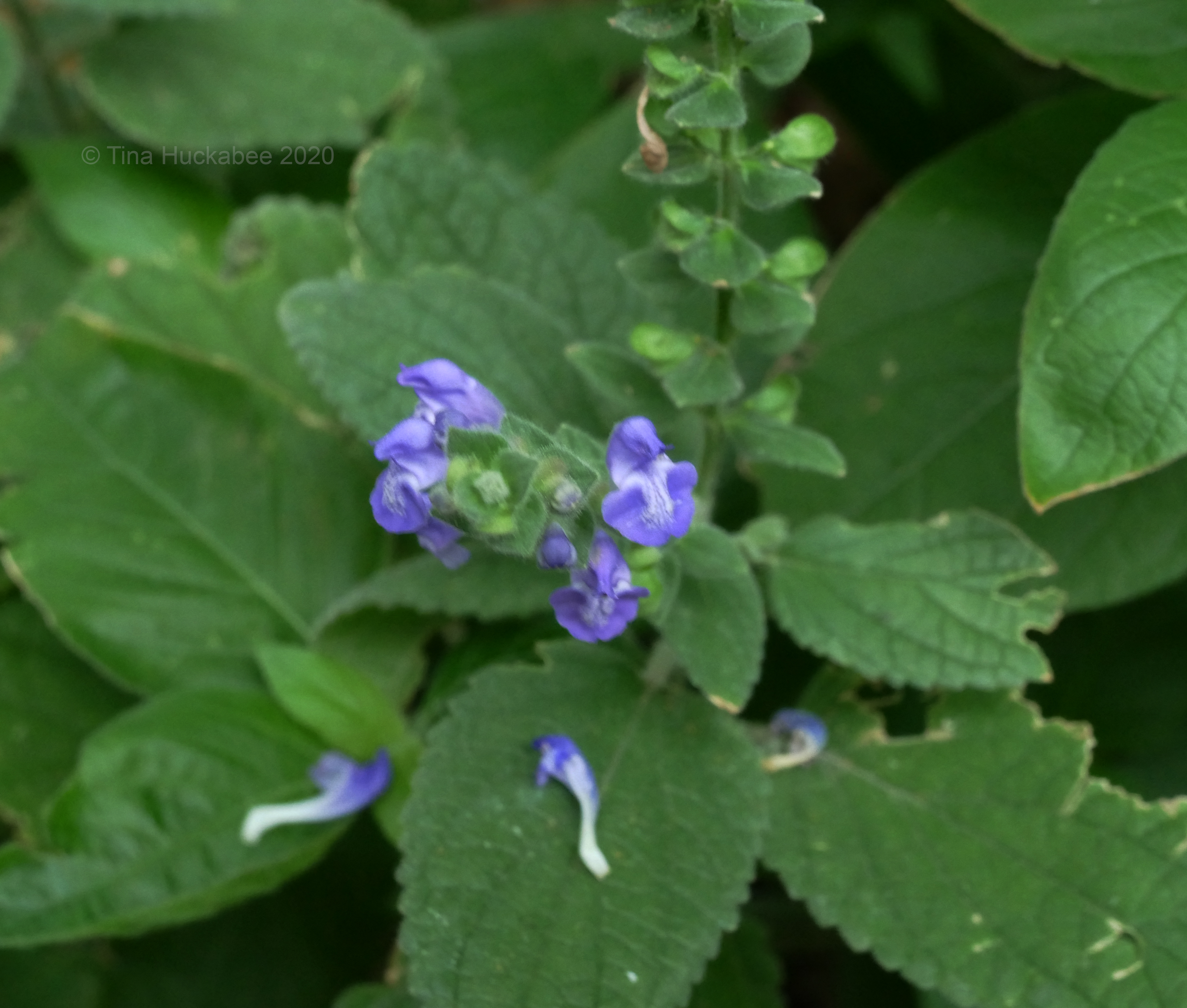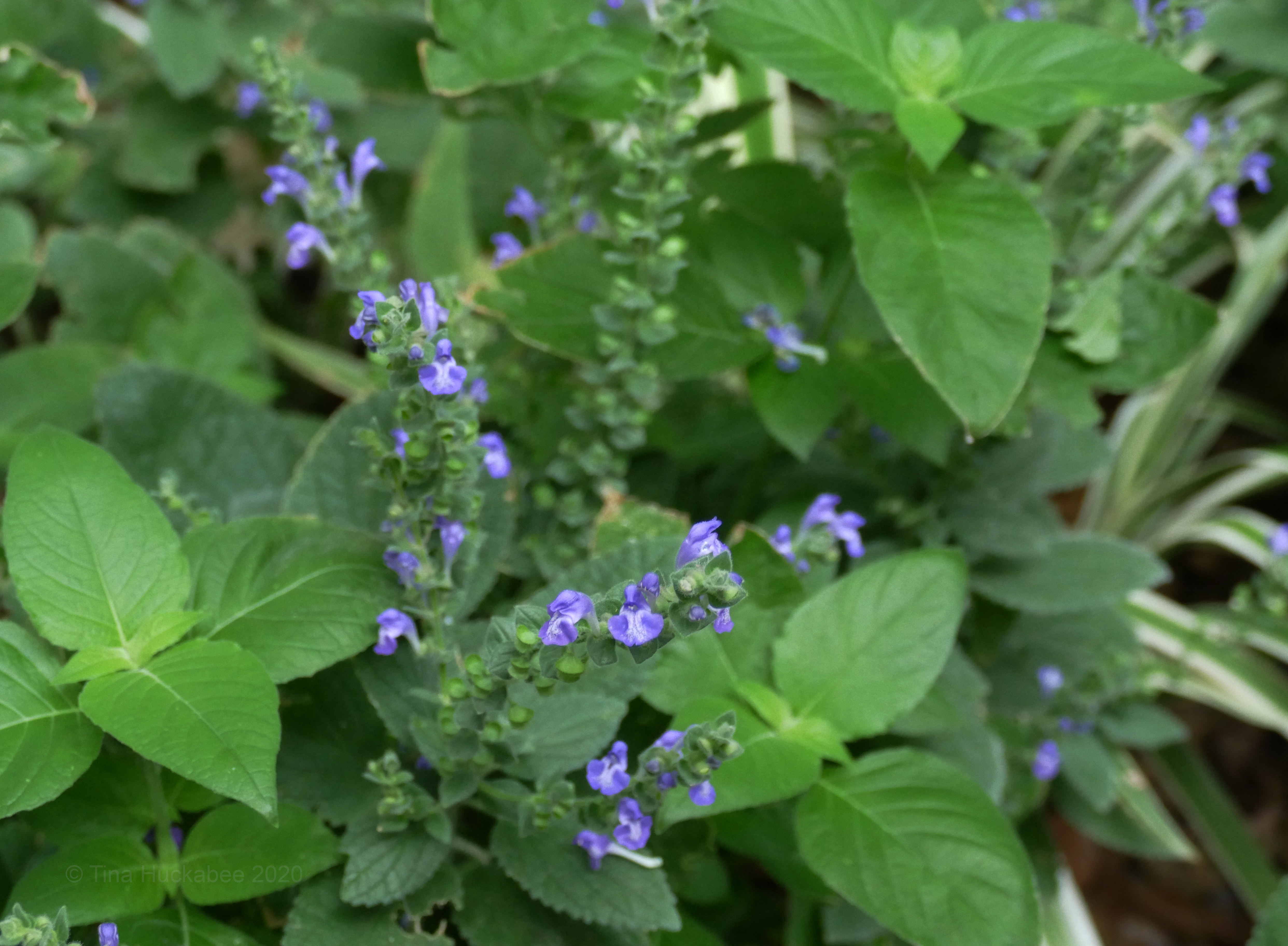 Heartleaf foliage is fetching and in a wide shot of the garden, they’re the primary attraction of the plant. But the flowers are visible–dots of lavender blue setting off the foliage–and the bees, native and honey, take notice. The blooms are popular among that crowd.