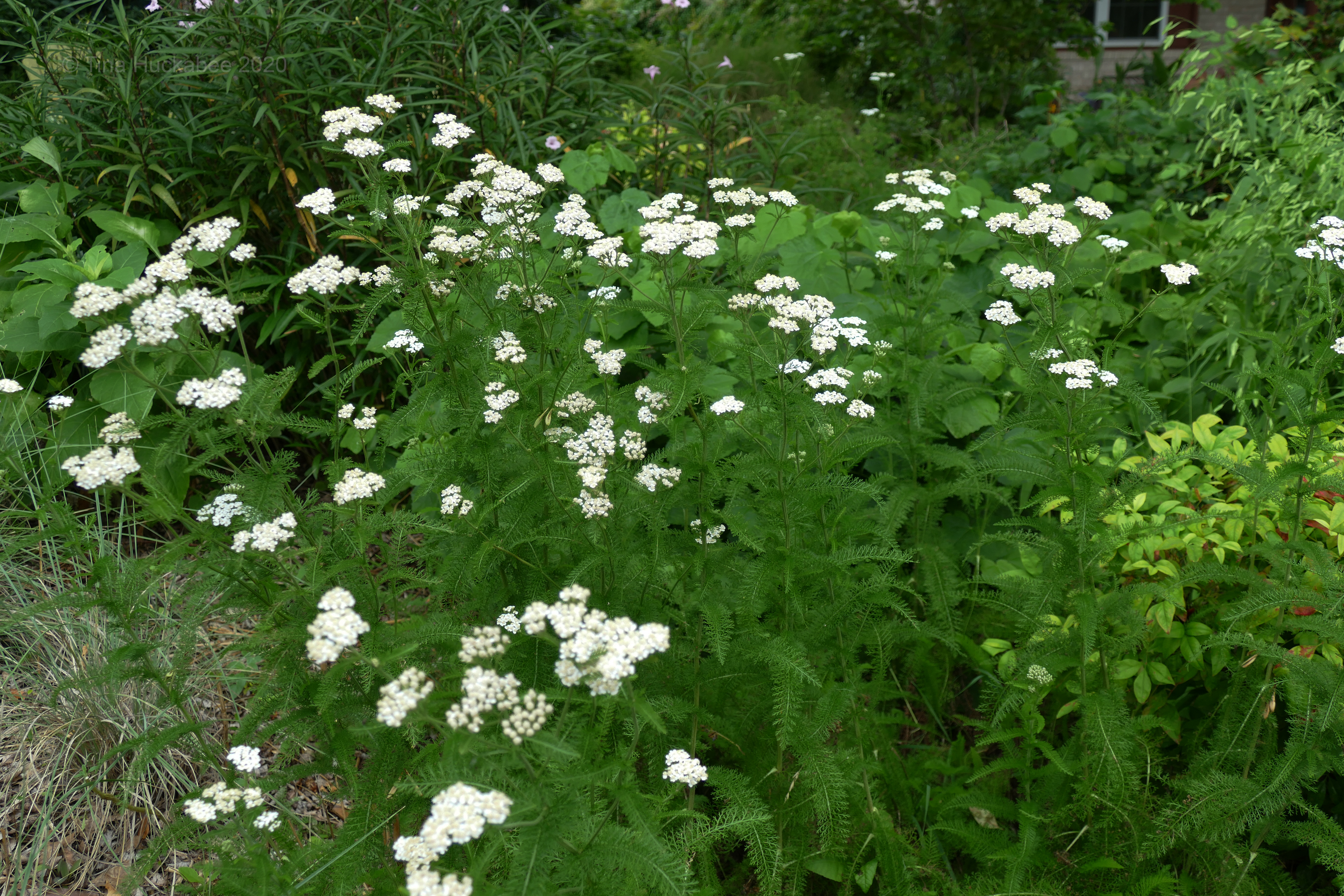 White flowers are refreshing and none more than those of Yarrow, Achillea millefolium. Feathery foliage pairs with these flat-topped clusters of tiny florets, just right for the smaller pollinators to work around. On this day, at this time, a fly works the blooms.