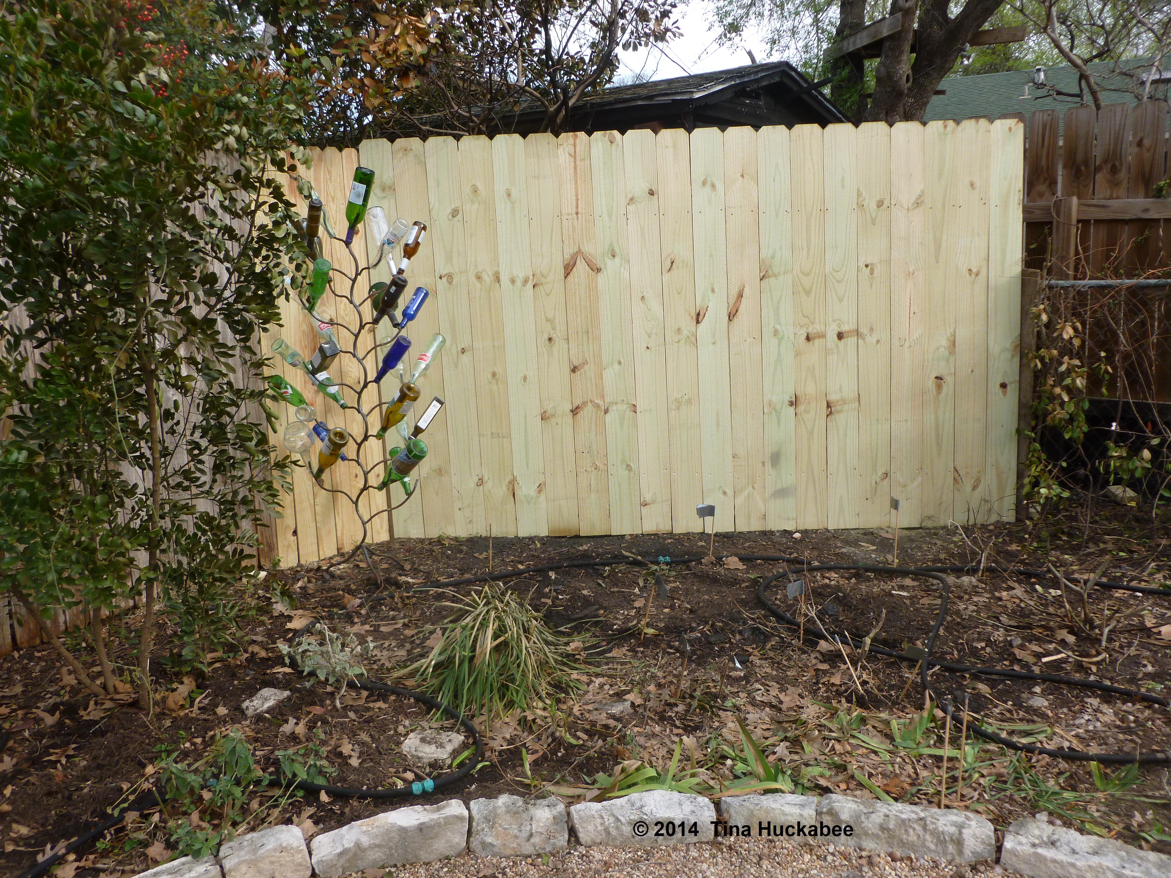 The discoloration between the new and old fence sections annoys me. I added bottles across the top of the lattice screen, in the hopes of distracting from the fire damaged neighbor’s fence and the little bit of the chain link that is visible. Also, as I age, kitsch appeals to me.