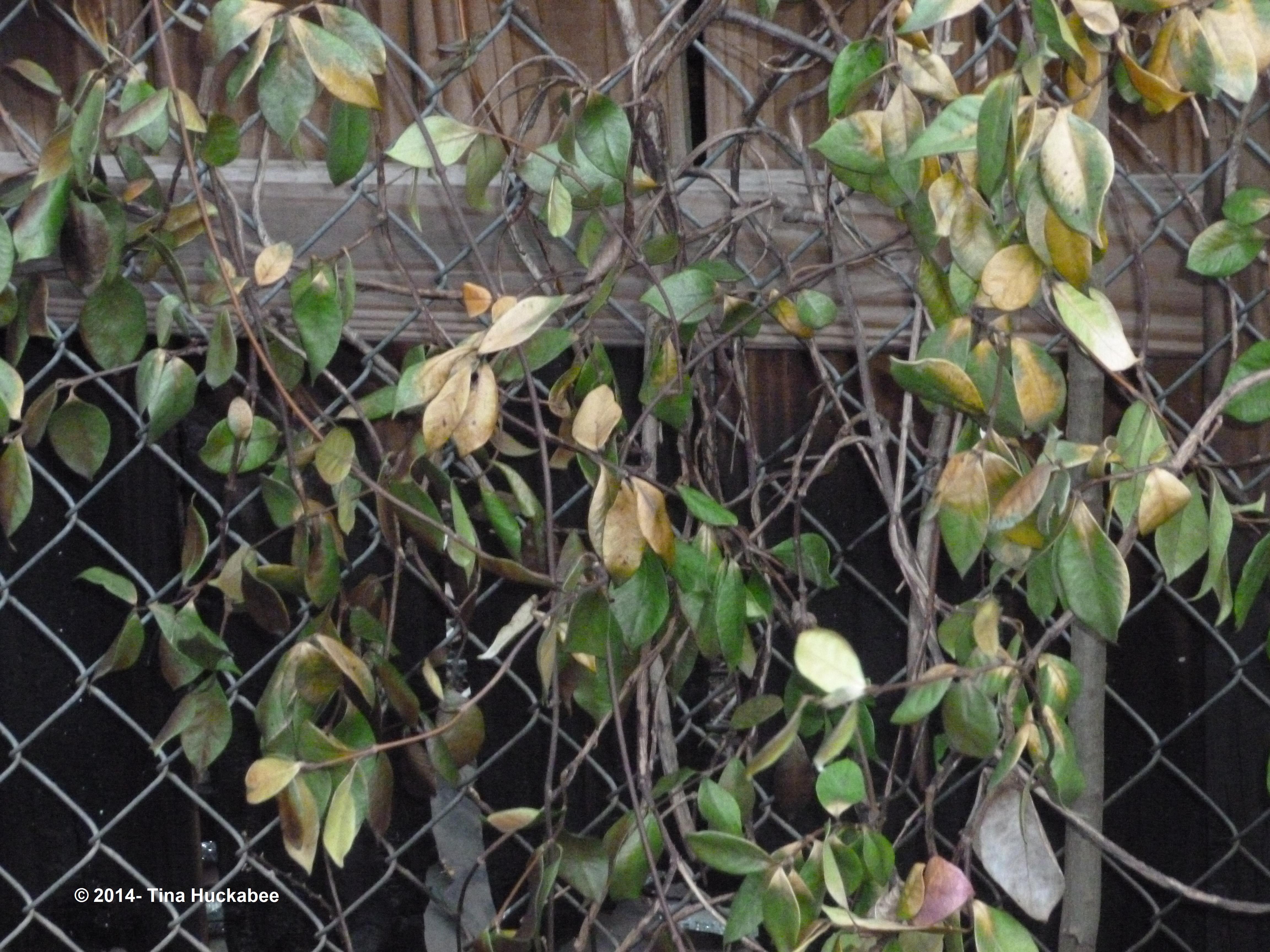 My poor Star Jasmine (Trachelospermum jasminoides), planted along the ugly chain link fence, was ruined.