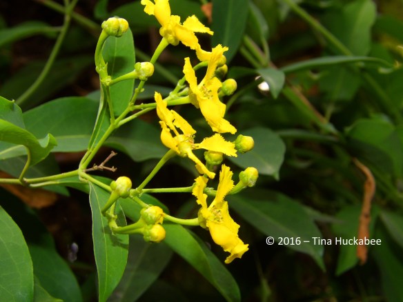 While not flowering now, clusters of bright yellow blooms grace this plant during summer and fall.