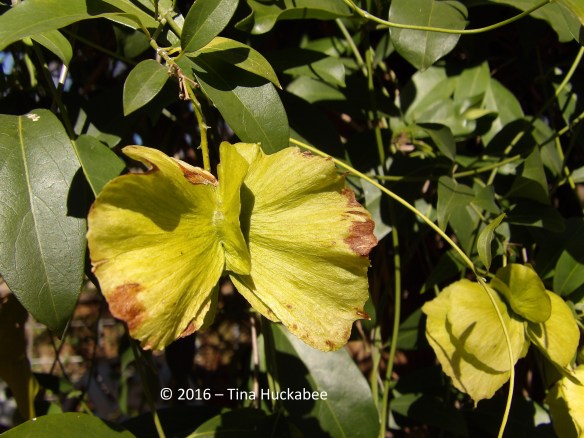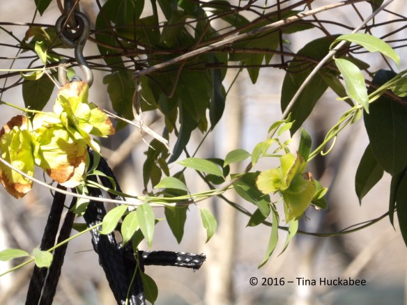 Most winters, the foliage of Mexican Butterfly Vine remains green, though it freezes back completely when we endure temperatures cold enough–well into the 20’s–and for a length of time. Even when knocked back completely by a hard freeze, it returns from its roots without fail.