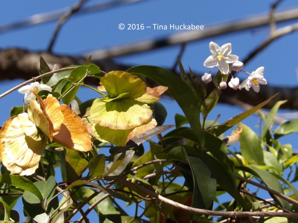 The vines draping the frame are Potato Vine, Solanum laxum on the left side, and Mexican Butterfly Vine, Mascagnia macroptera, on the right.