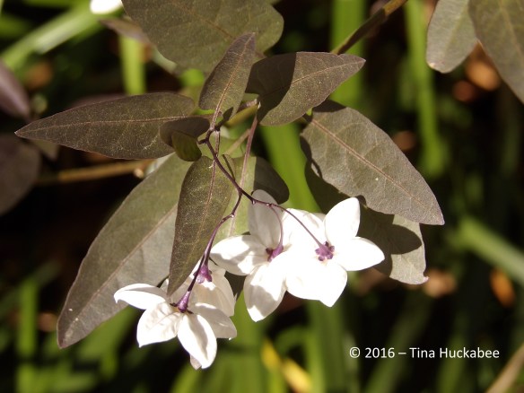 The Potato Vine is at its blooming best in fall, winter, and spring. Our summers are too toasty and dry for the blooms to peek out, though the foliage remains green year-round.