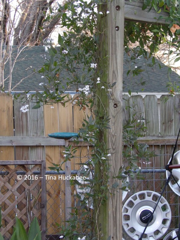 As winter seems a no-show this year here in Austin, Texas, there are plenty of greens, partial greens, as well as blooms in my garden this February. Two of the green things twine along this swing beam, which we built long ago for a playscape, but was re-purposed into an adult weekend snoozing spot.