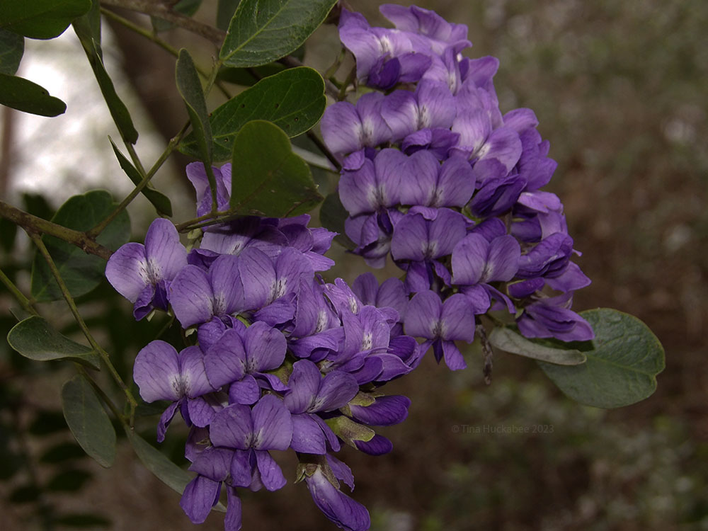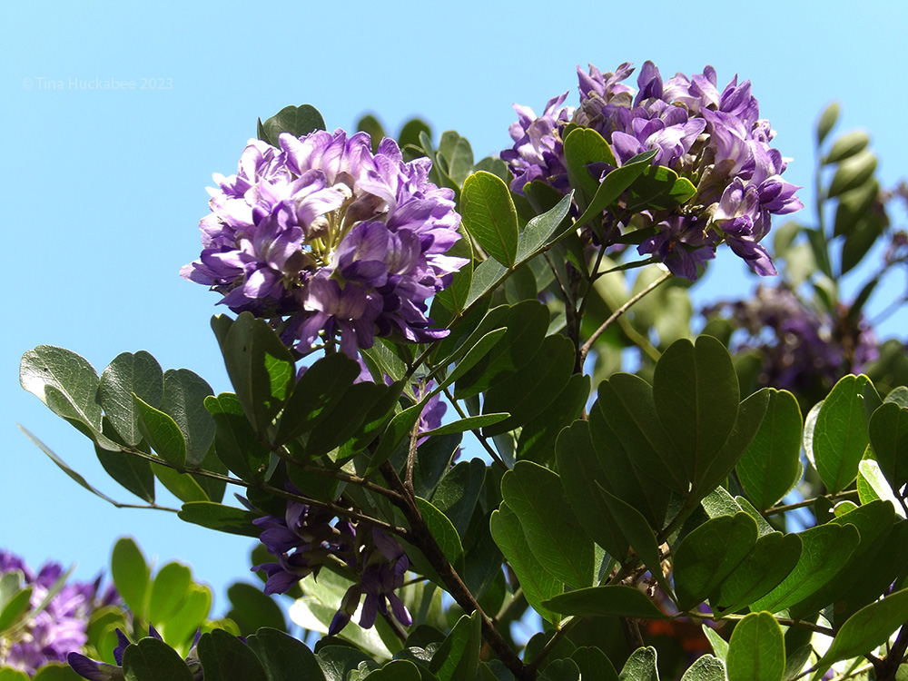 My Texas Mountain Laurels have successfully withstood Texas’ capricious weather patterns, from extreme drought and heat, to mild winters suddenly punctuated by bitter cold, icy conditions. Two years ago, during the historic nine day deep freeze, not-so-affectionately called Snowpocalypse or Snowmageddon, both of my laurels endured damage. Several limbs, big and small, died back. Some I pruned, others I left for the birds’ perching pleasure. No blooms happened that March, but both trees survived, albeit thinner in foliage and form.