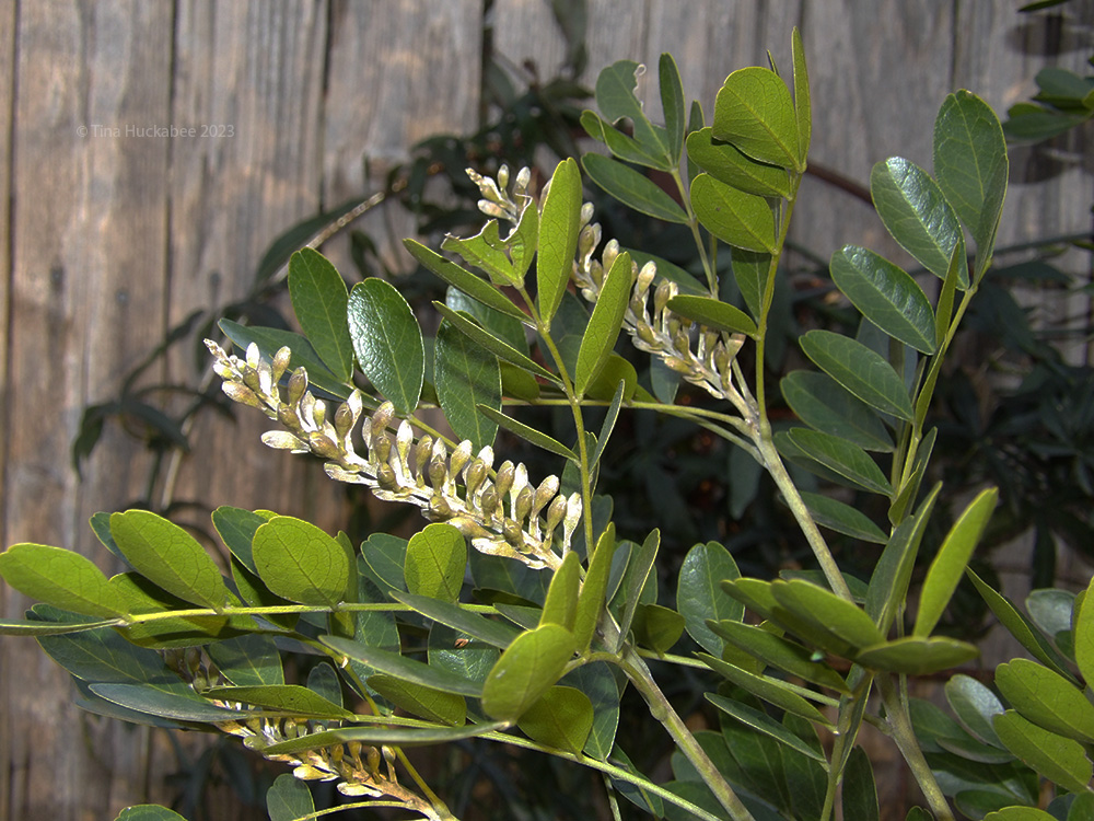 This post is part of a series I call A Seasonal Look. Most plants change their looks over the course of a year: they bloom, set seed, maybe change foliage color, drop foliage, and become bare-limb when dormant. Or perhaps they’re evergreen, blooming on-and-off throughout the year, according to seasonal variations. Certainly Texas Mountain Laurel is no different in that it demonstrates changes. In late winter the plant begins its ramp-up to flowering, bub spikes grow with spring blooms to follow; seedpod development occurs during late spring, continuing their maturity through summer. By fall, the toasty seedpods are ready to drop, allowing the tree to rest before spring flowering beckons.