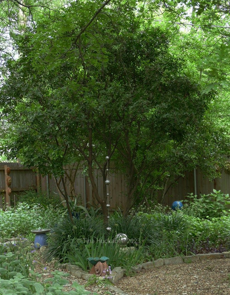 After the purple flower power show, Texas Mountain Laurels are a steady presence in the landscape: the luxuriant, rich green foliage surrounds warm, textured bark, creating a lovely shaped tree. Some gardeners prune to a single trunk, but if you do that, you’ll always have to prune, because the plant wants to grow and sprout new limbs. I’m on team multi-trunk: I love the natural shape of these trees and see no need to prune to a formal shape. Nature has done a fine job of fashioning something exceptional–why mess with it?