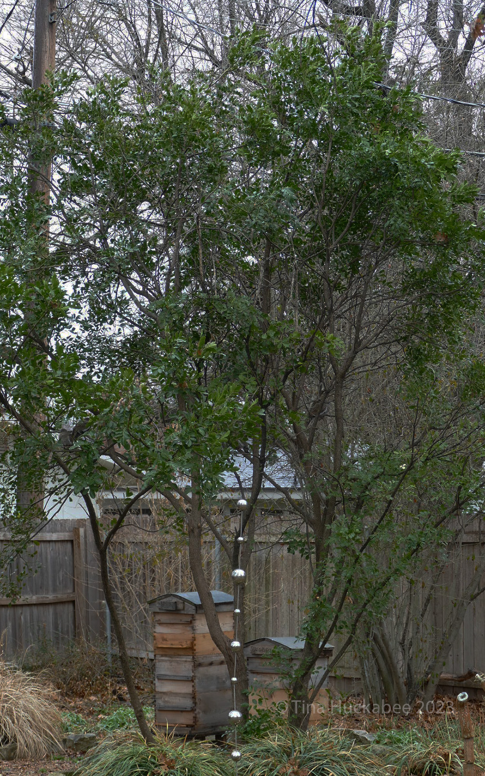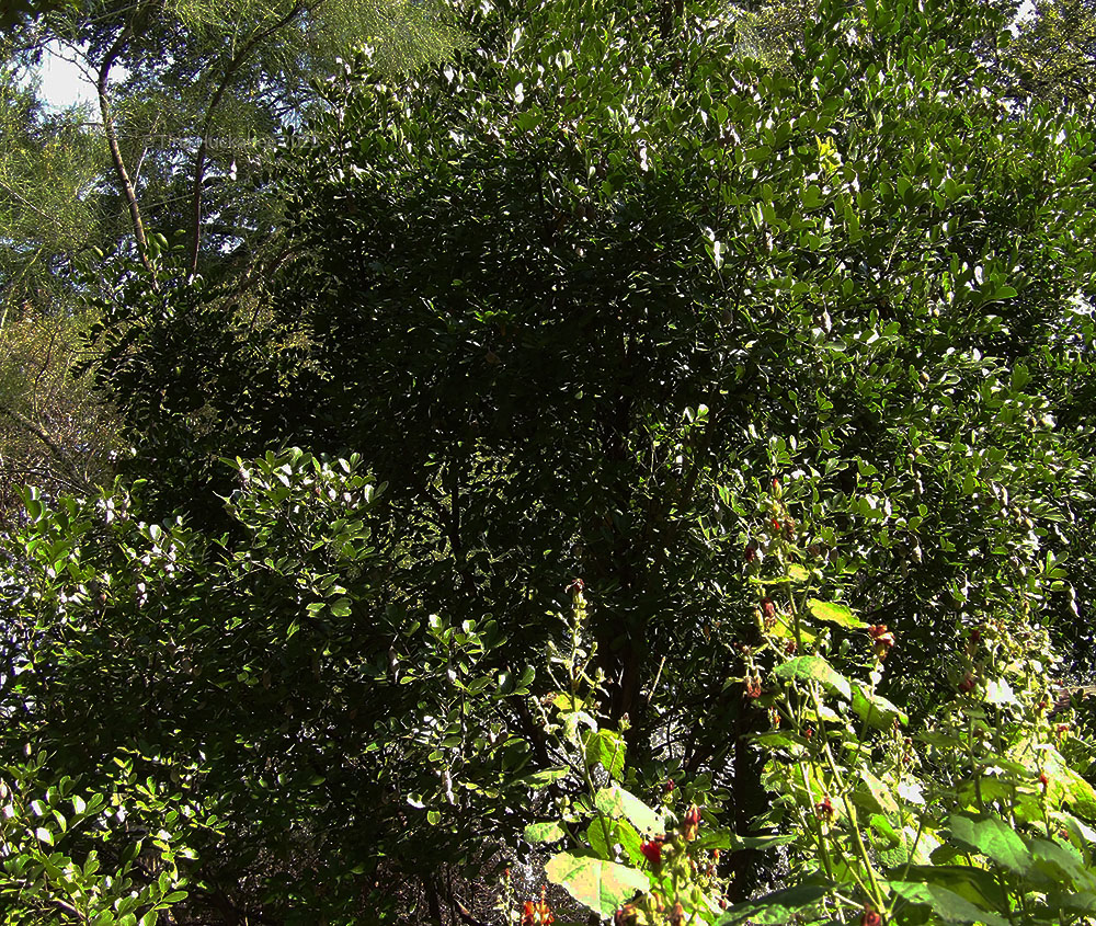 This is the older Texas Mountain Laurel a few days before the ice storm. The upper left quadrant of foliage is where I have recently observed the Eastern Screech Owl couple perching together, as they meet one another each evening at sundown.