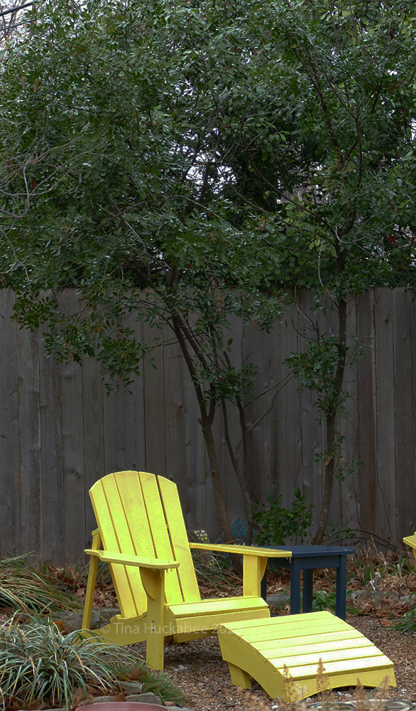 The groundsel echos the Adirondack chairs: cheery blooms, comfortable chairs.
