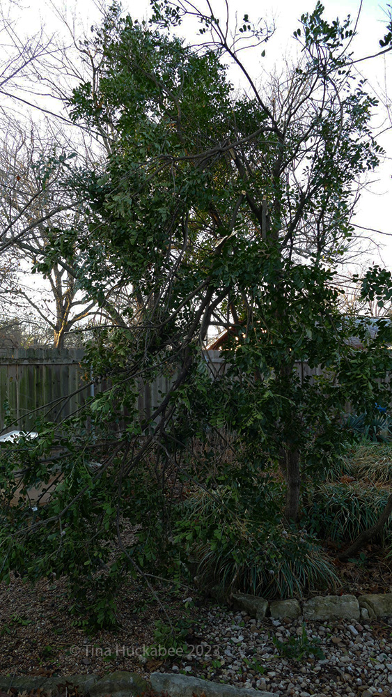 The half-inch of ice played havoc on tree limbs (and utility lines) all over Central Texas. The only damage in my garden was to my older Texas Mountain Laurel. This specimen, already weakened by age and 2021’s Snowpocalypse, suffered several breaks due to the heavy ice, impacting its canopy.