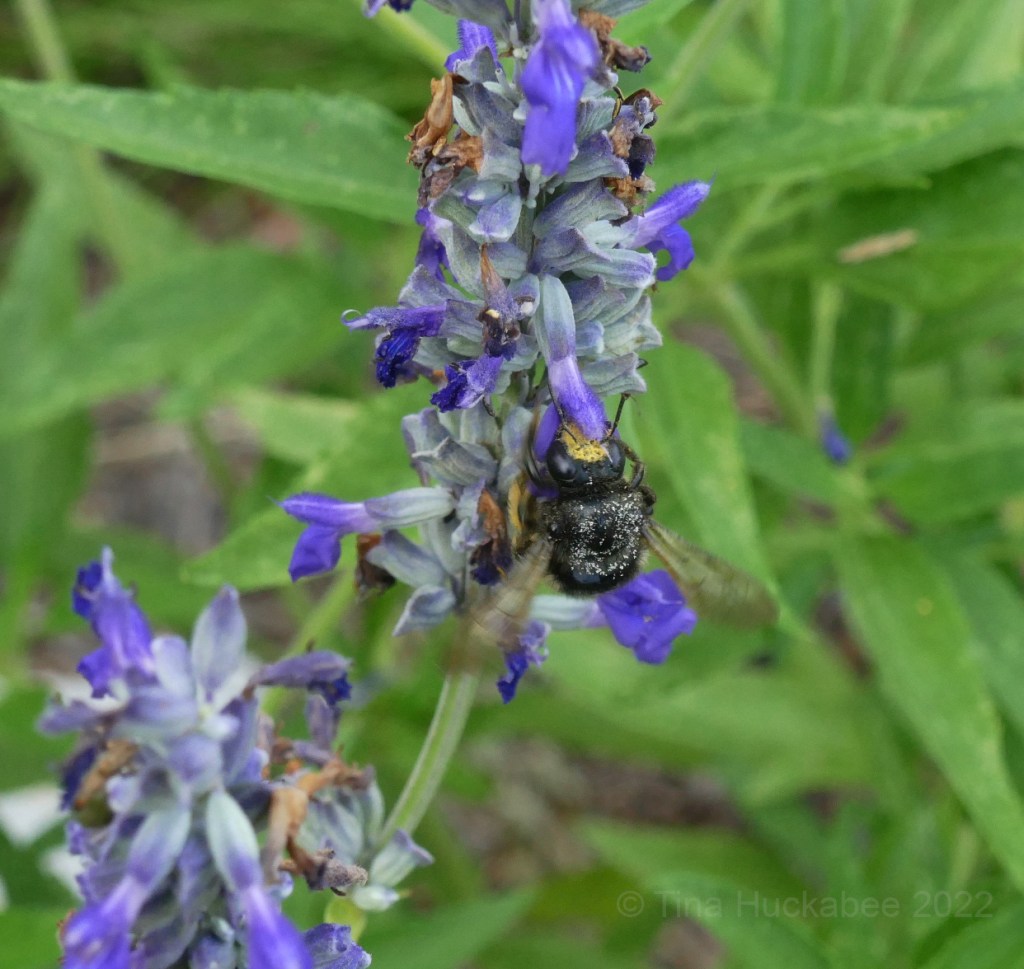 Sometimes, a robber is sprinkled with pollen, perhaps due to buzz pollination. Buzz pollination happens when certain bees vibrate their strong thoracic muscles, vibrating, or sonicating, the pollen grains from flowers’ anthers. During foraging, this Horsefly-like Carpenter bee might have buzzed pollinated on a different flower, its back carrying sprinkles from the loosened pollen onward through the garden. The bee is too big to crawl into this bloom, a Henry Duelberg sage, Salvia farinacea, so stealing is the way to go.