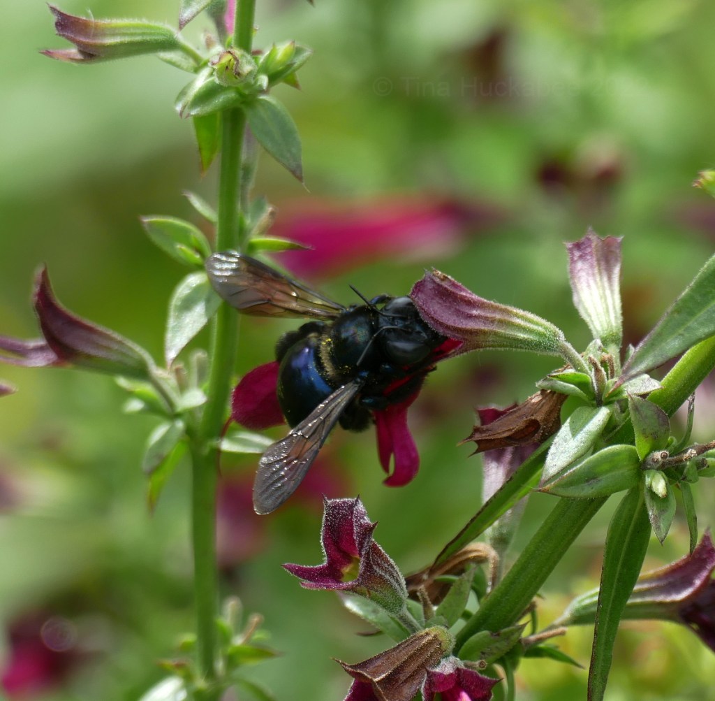 This Southern Carpenter bee, Xylocopa micans, participating in nectar robbing, is poised to poke its proboscis into the bloom of a Big Red Sage, Salvia penstemonoides.