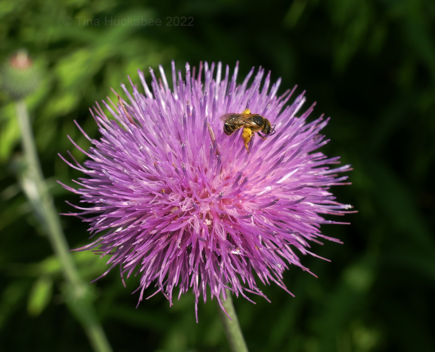 Of course, there are those who pollinate the old-fashioned way, crawling all over a bloom, collecting pollen as they go! This native bee, perhaps a Mining bee, Andrenidae, or a Plasterer bee, Colletidae, enthusiastically worked the flower of a Texas thistle, Cirsium texanum.