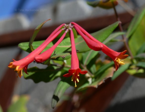 This past week saw the first blooms of the Coral honeysuckle, Lonicera sempervirens. For now, only one bloom in this drooping cluster is willing to flounce its yellow petticoat.