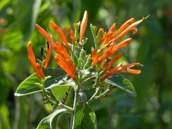 As mentioned in my last post, orange is this winter’s signature color. Mexican honeysuckle, Justicia spicigera, is covered in tubular orange goodies, eager for pollinators to awake and work.