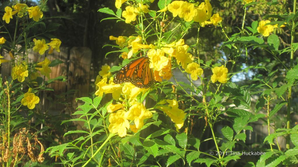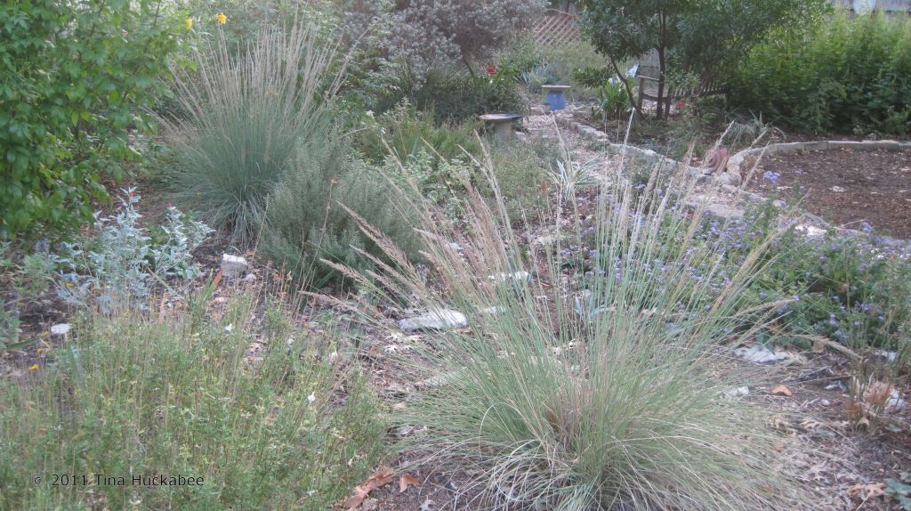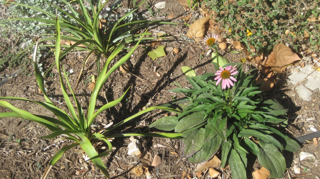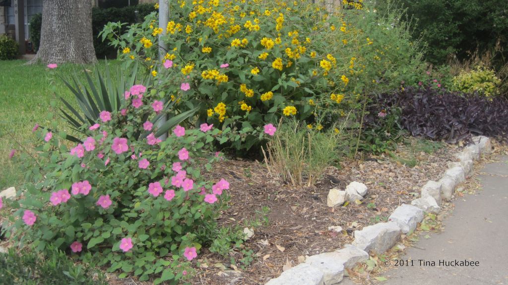 Also, you’ll notice that the trees look like it’s still we’re still in winter. Arizona Ash trees are the signature trees in both our front gardens and these two trees were badly damaged by February’s winter storm. They will never recover and will never again be fully foliaged trees. The green that you see, along the trunks and the lower branches, is all the trees will ever produce. We’ll be removing our trees later in in autumn. My once shady, west-facing front garden will become a full sun garden and changes are required. Some of the current garden inhabitants won’t like the Texas sun beating down everyday and will be removed; sun-lovers like native grasses and sun-worshipping perennials and shrubs will thrive in the heat and blossom with the blasts of daily sun. I’m sure whatever sunflowers show up next year will be perfectly happy in the new conditions. The end of a tree is a sad, sad thing and the end of two adjacent trees doubly so. I’ll miss their cooling effects, sweet movement of foliage in the wind, and the activities and songs of birds taking refuge in their canopies.