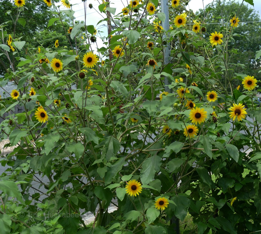 Nothing says summer like sunflowers!  I feed my urban bird visitors black-oiled sunflower seed year-round and each spring dozens of individual sunflowers germinate from those very seeds.  I cull most of the seedlings, but allow some to stay.   They always grow tall, but with this year’s rain, they’ve grown Jack-in-the-beanstalk giant.