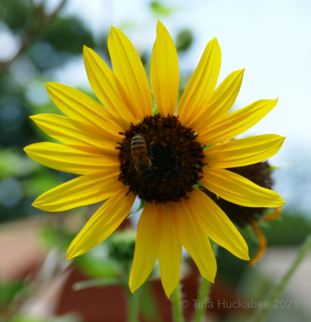 The pollinators have worked the sunflower since opening day in April or May. Honeybees are especially fond of sunflowers and are often covered with pollen after they’ve spent some time nuzzled in the flowers.