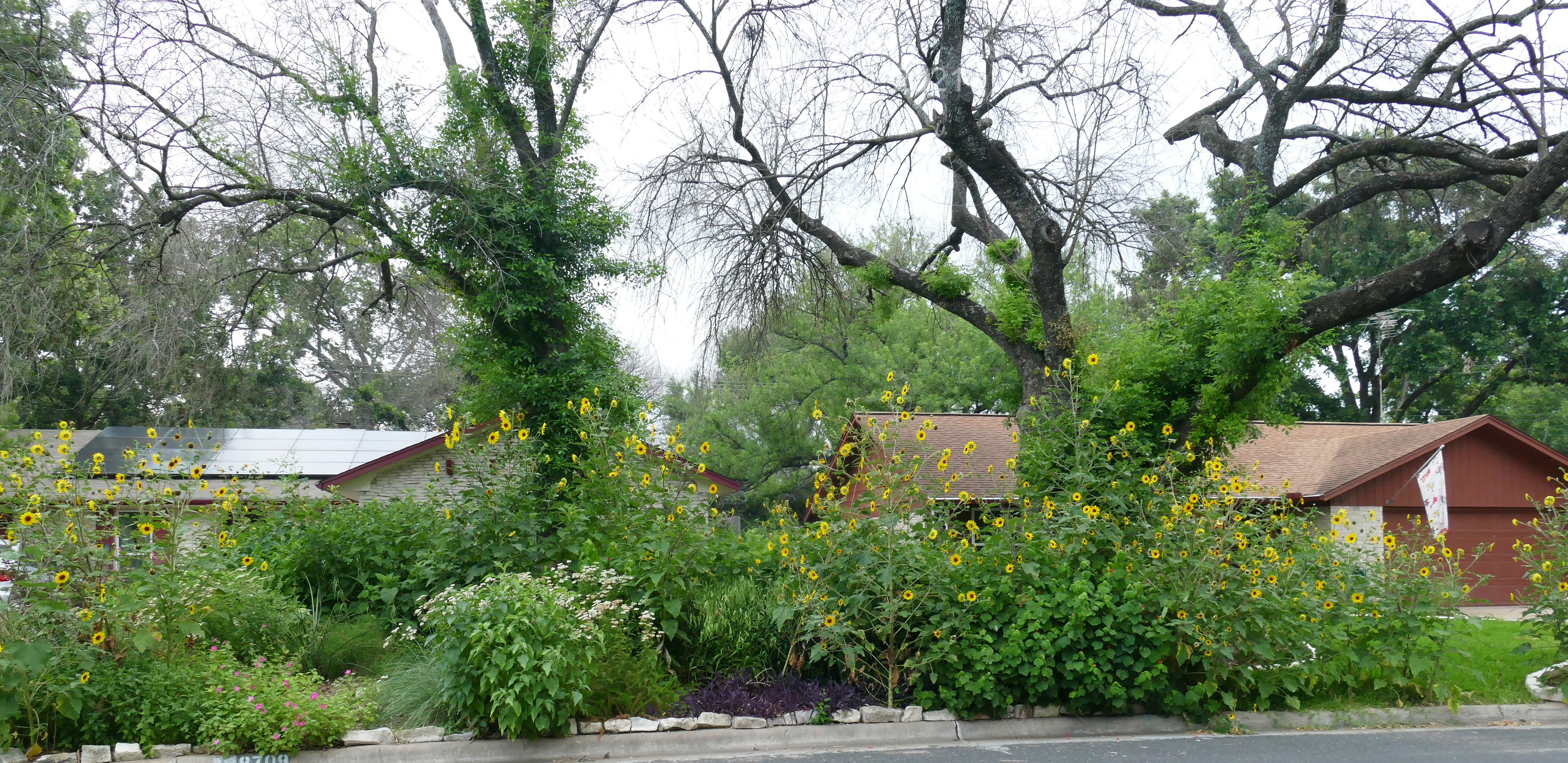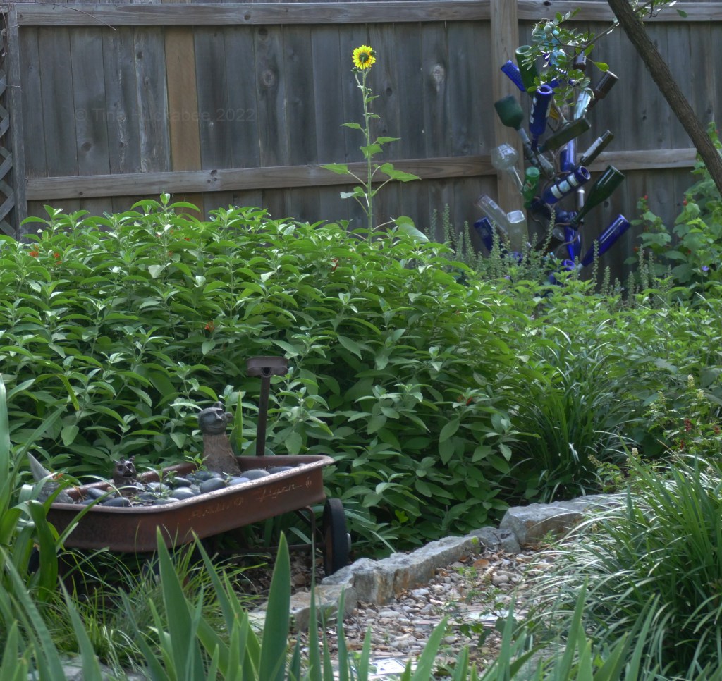 Also, you’ll notice that the trees look like it’s still we’re still in winter. Arizona Ash trees are the signature trees in both our front gardens and these two trees were badly damaged by February’s winter storm. They will never recover and will never again be fully foliaged trees. The green that you see, along the trunks and the lower branches, is all the trees will ever produce. We’ll be removing our trees later in in autumn. My once shady, west-facing front garden will become a full sun garden and changes are required. Some of the current garden inhabitants won’t like the Texas sun beating down everyday and will be removed; sun-lovers like native grasses and sun-worshipping perennials and shrubs will thrive in the heat and blossom with the blasts of daily sun. I’m sure whatever sunflowers show up next year will be perfectly happy in the new conditions. The end of a tree is a sad, sad thing and the end of two adjacent trees doubly so. I’ll miss their cooling effects, sweet movement of foliage in the wind, and the activities and songs of birds taking refuge in their canopies.
