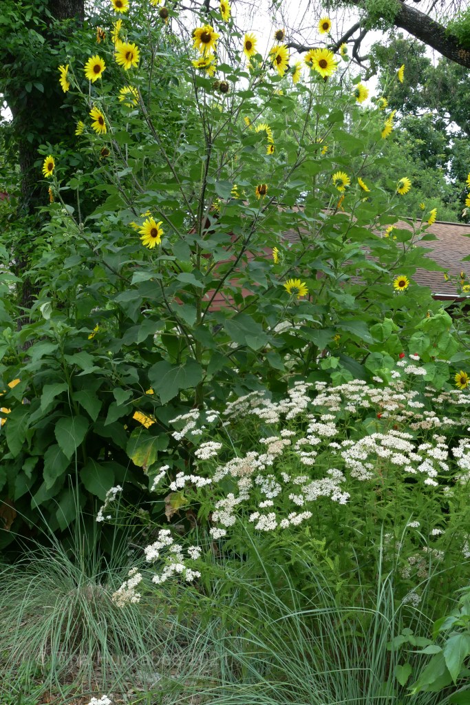 I kept most of the sunflowers at the center and back of my gardens so they wouldn’t interfere too much with beloved seasonal perennials like creamy Yarrow, Achillea millefolium and cheery Zexmenia, Wedelia acapulucensis var. hispida.