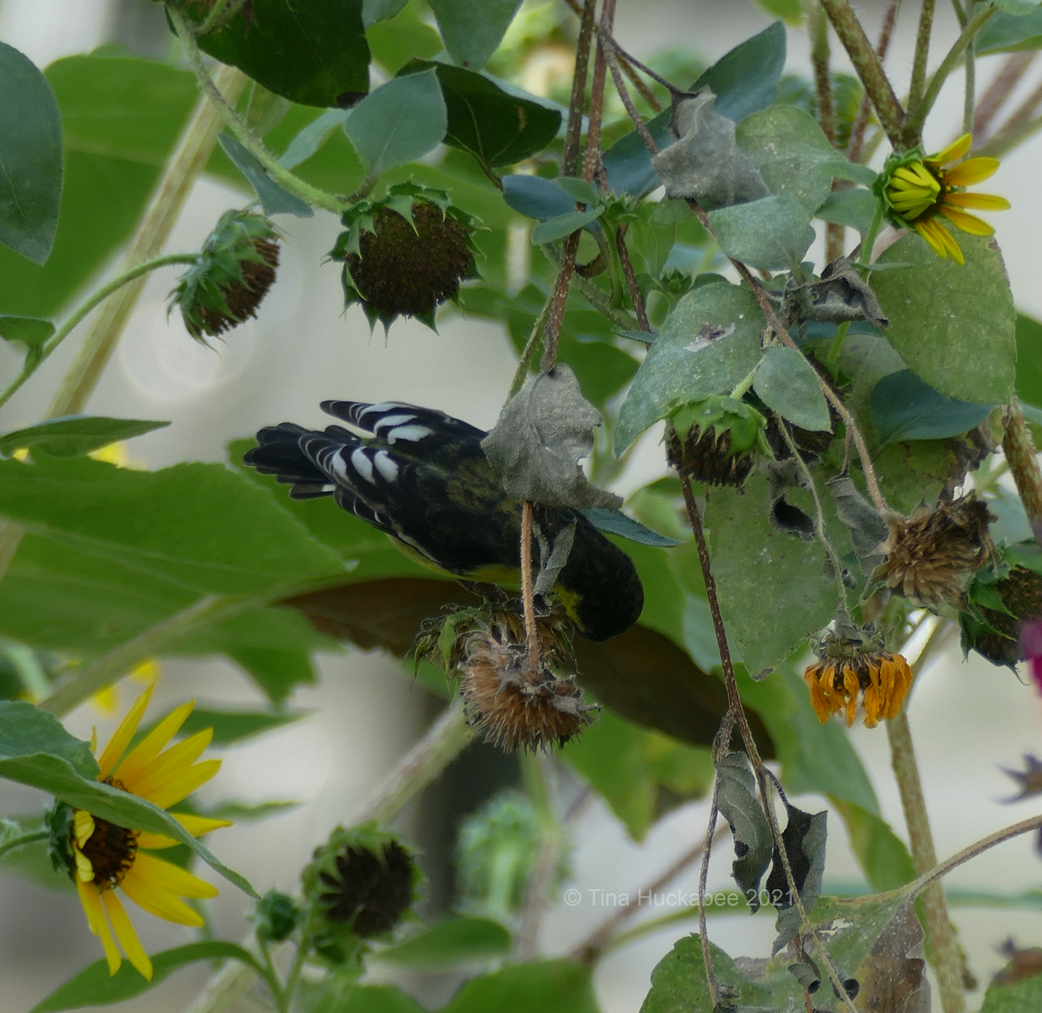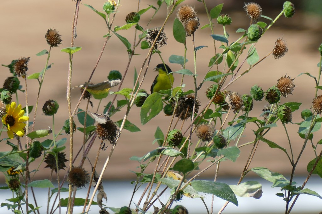 As the flowers fade and seeds replace blooms, House and Lesser goldfinches (and other birds, too) become feeders-in-residence on the tall annuals.