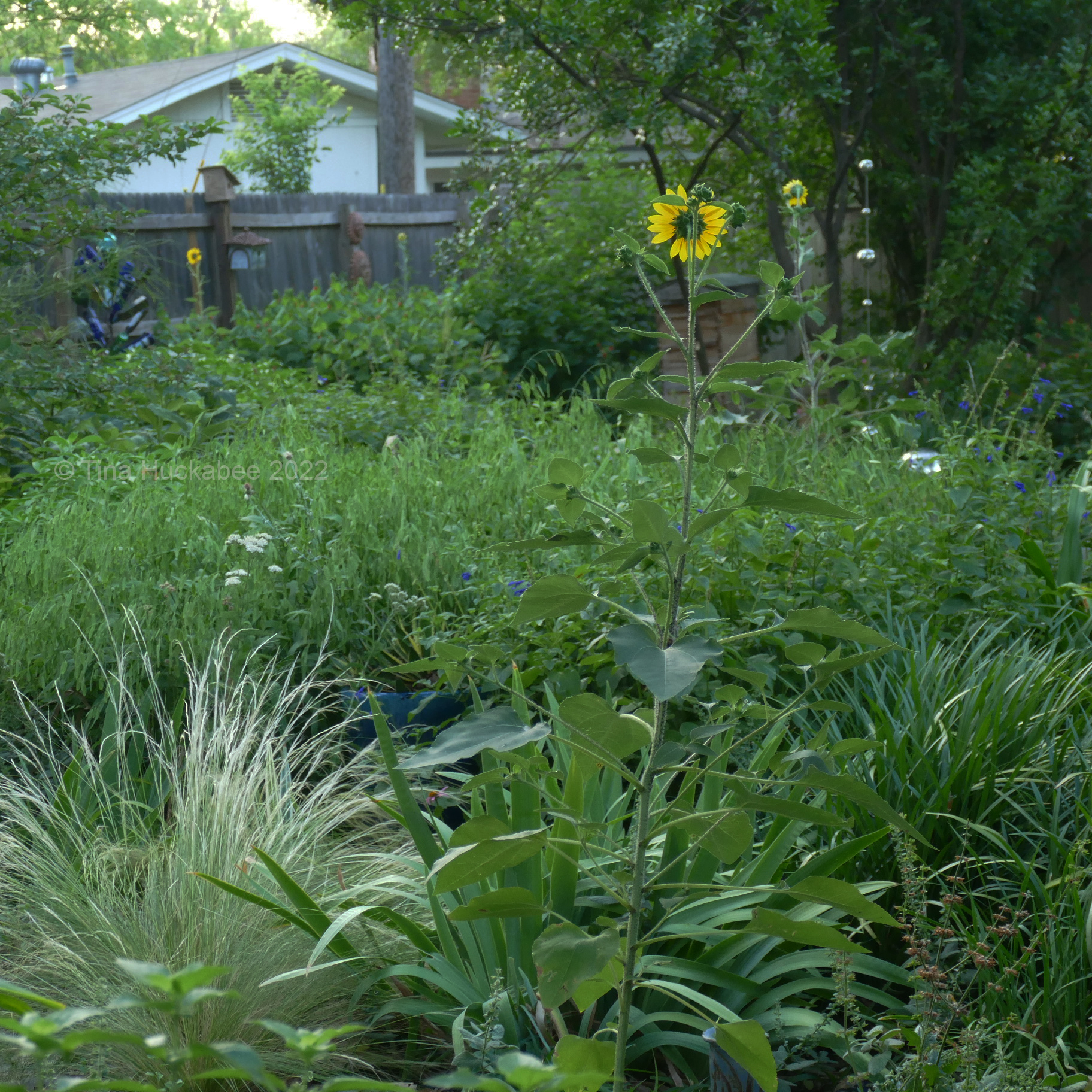 Having chosen its particular garden, each sunflower stands its ground.