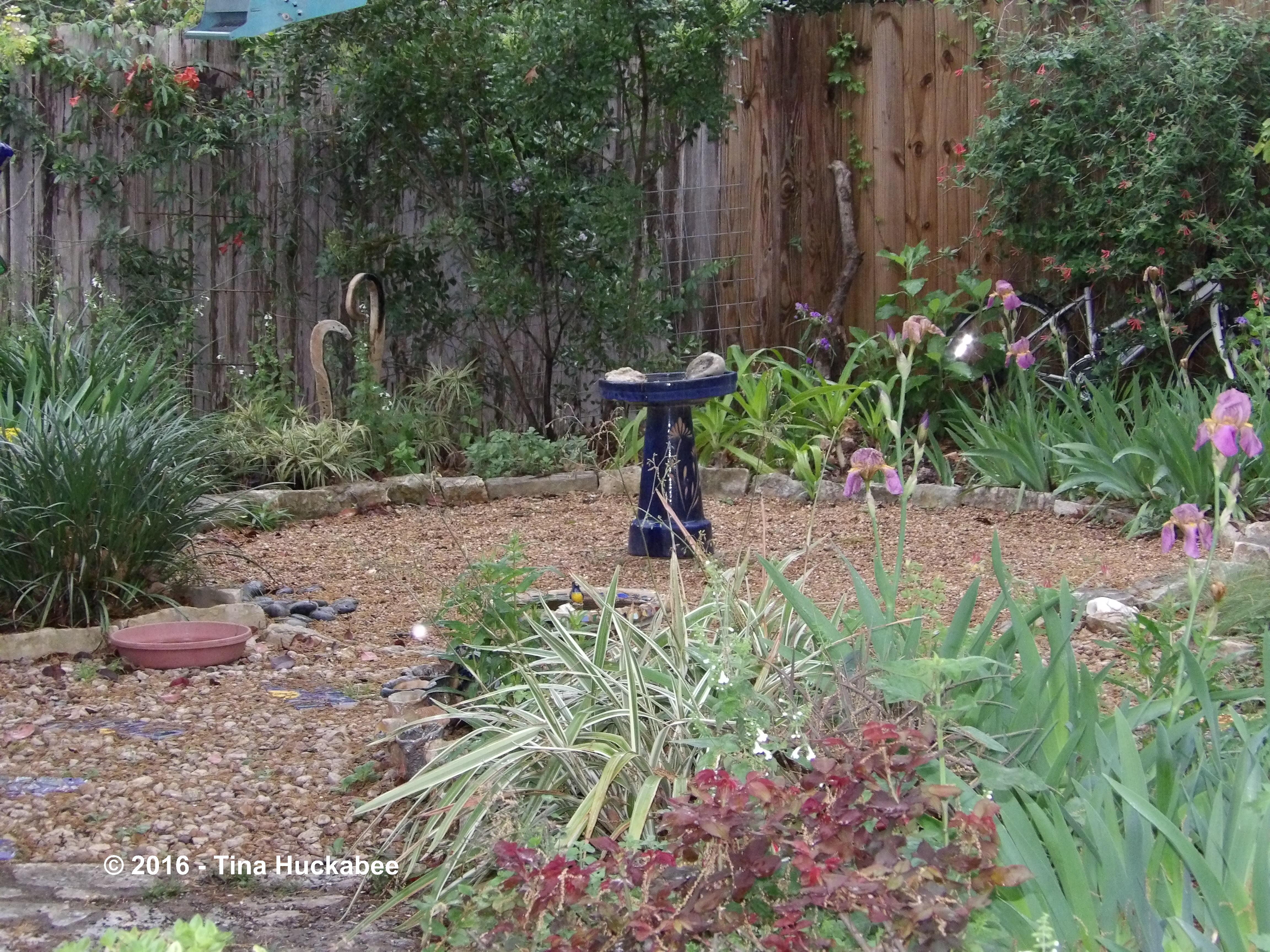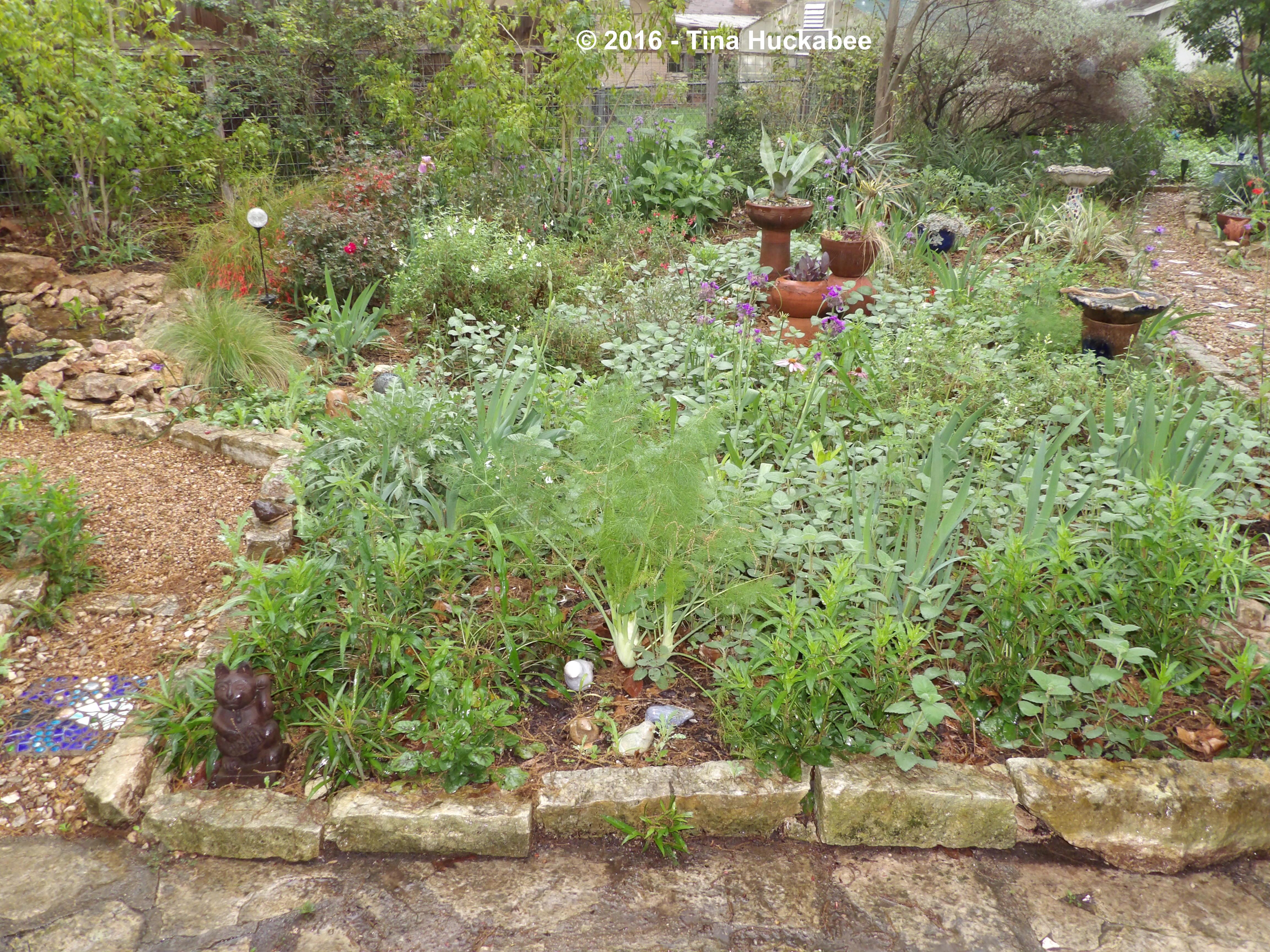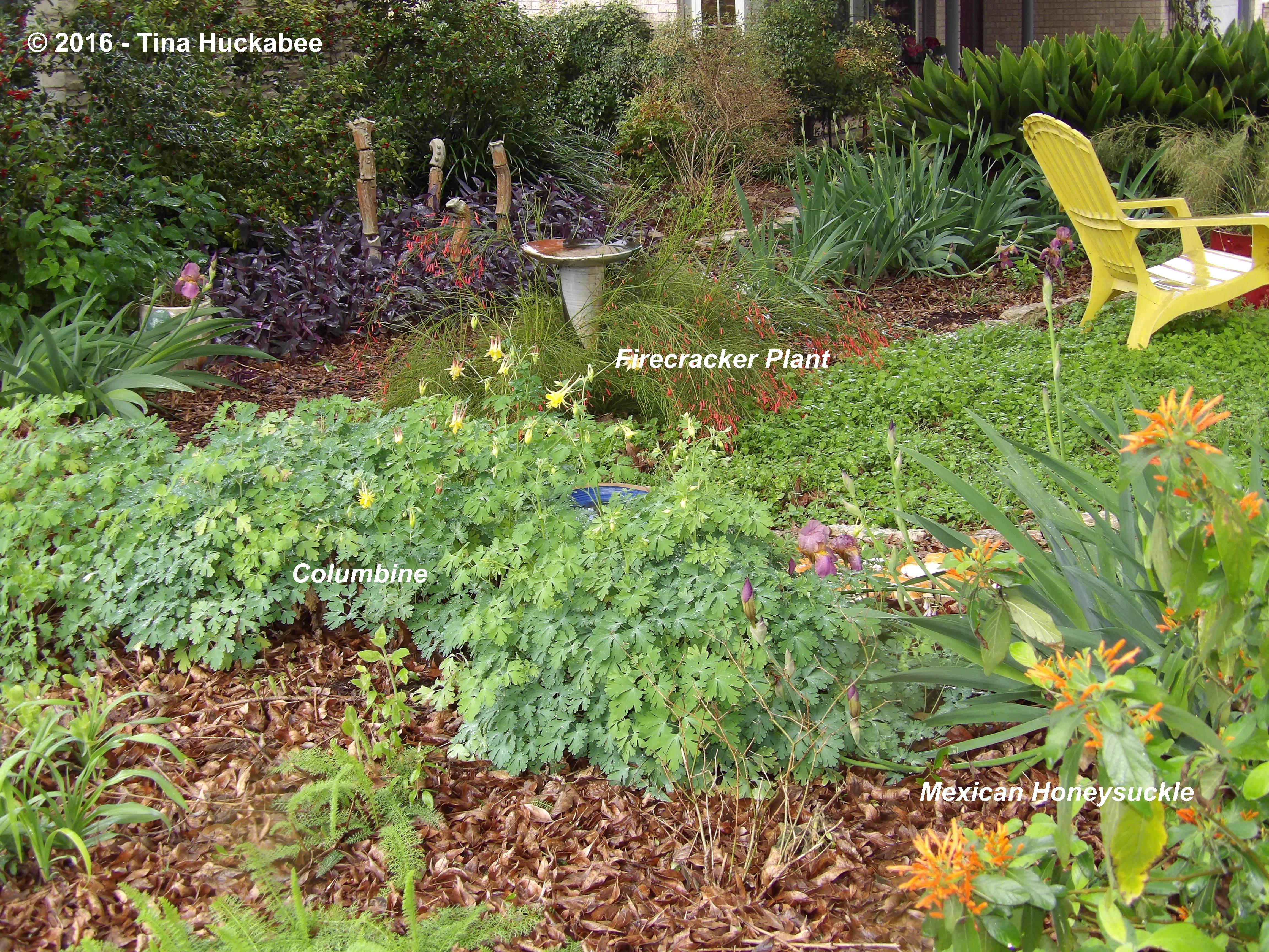 Spring bloomers like Columbine, Aquilegia chrysantha and A. canadensis, Iris, Mexican honeysuckle, Justicia spicigera, and this year (due to our non-winter), both Firecracker plant and white Tropical sage, as well as some smaller groundcover-type perennials, add color and pollinator pizzazz to this garden.