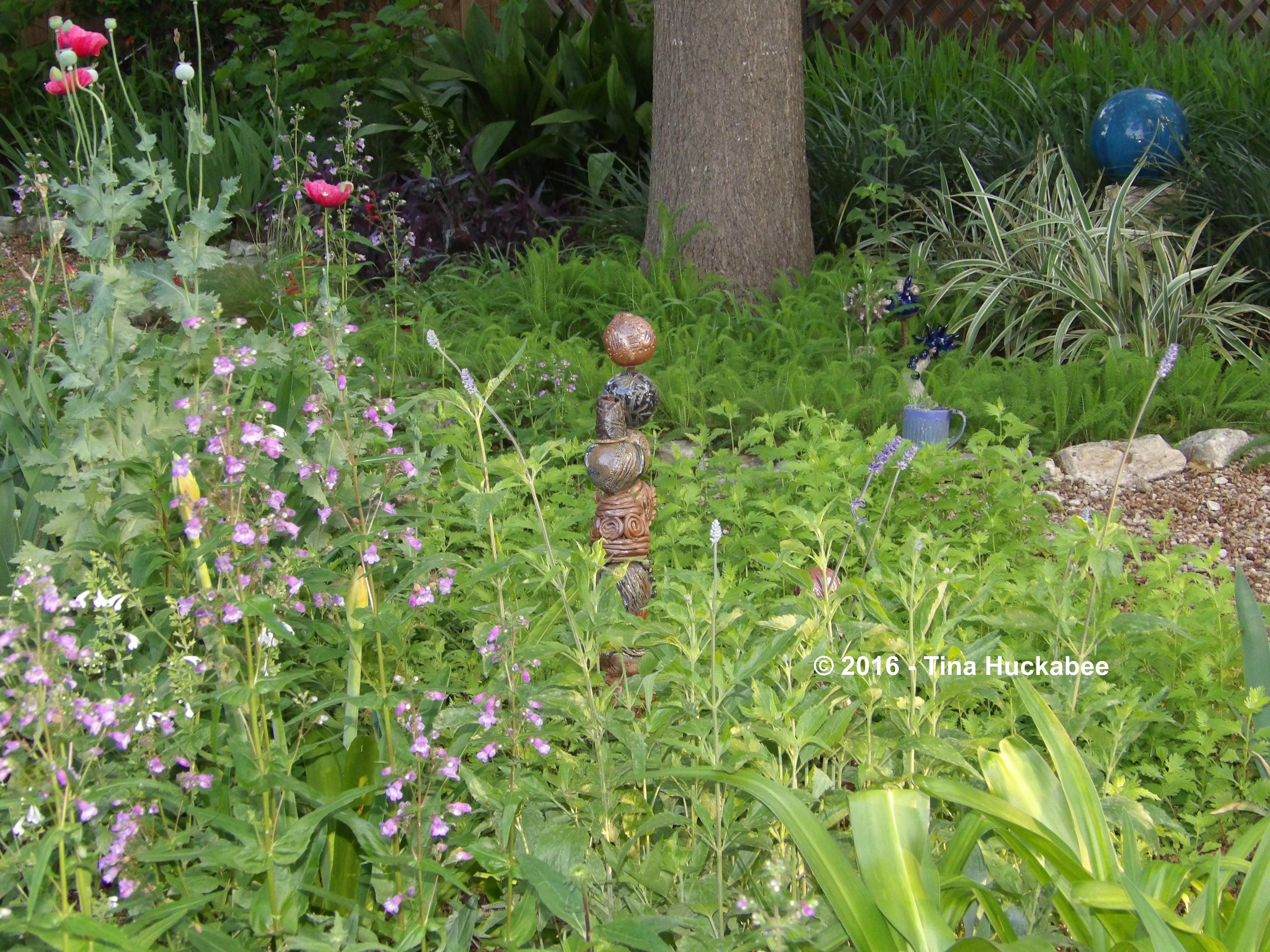 The narrow part of the back garden is given almost exclusively to shade plants, but there are bloomers in the mix throughout the long growing season.